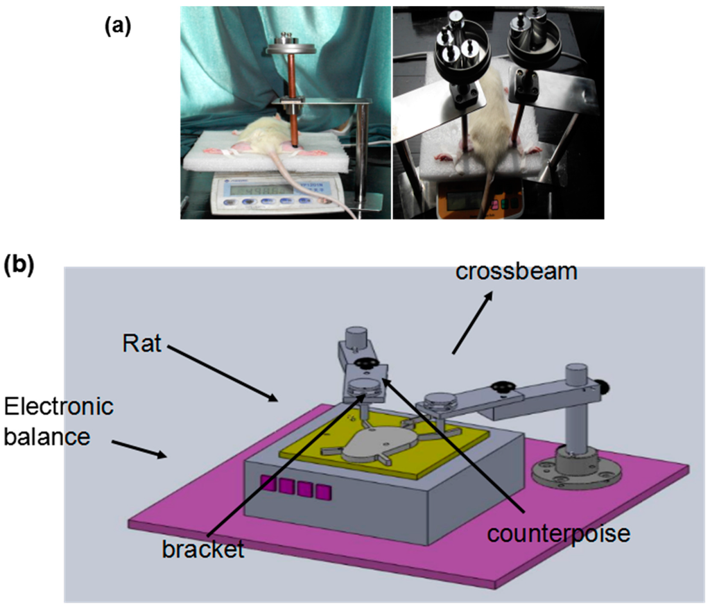 Establishment of a rat pressure ulcer model. (a) Application of the compression load to the shanks of a rat; (b) Cartoon for the device used for the rat pressure ulcer model.