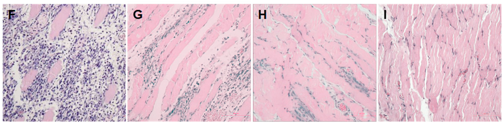 Morphology of muscle tissues. Compressed muscles were isolated at various cycles of compression and for various recovery days. Tissue slides were stained with H&E. Images were acquired using a light microscope with a ×200 objective. (A) (Control): The myofibers of control muscles were tightly packed; (B,C) (1 and 3 cycles): Compressed muscles tissues in the experimental group generally showed histopathological characteristics, including waxy degeneration or vacuolization; (D) (6 cycles): showed massive nuclei aggregation in the interstitial space; (E) (9 cycles): showed muscle fiber dissolution, fracture, and hyaline degeneration; (F) (1 day): Compressed muscles tissues in the recovery group showed multiple inflammatory cells in the necrosis area; (G–I) (3, 5, 7 days): myofiber atrophy and derangement as well as inflammatory cell infiltration were still observed.