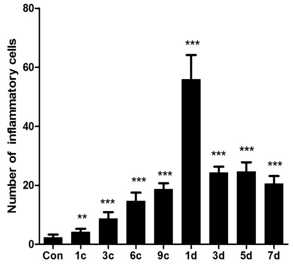Number of inflammatory cells in compressed muscle tissue of rats in various groups (** p < 0.01, *** p < 0.001 vs. control group).