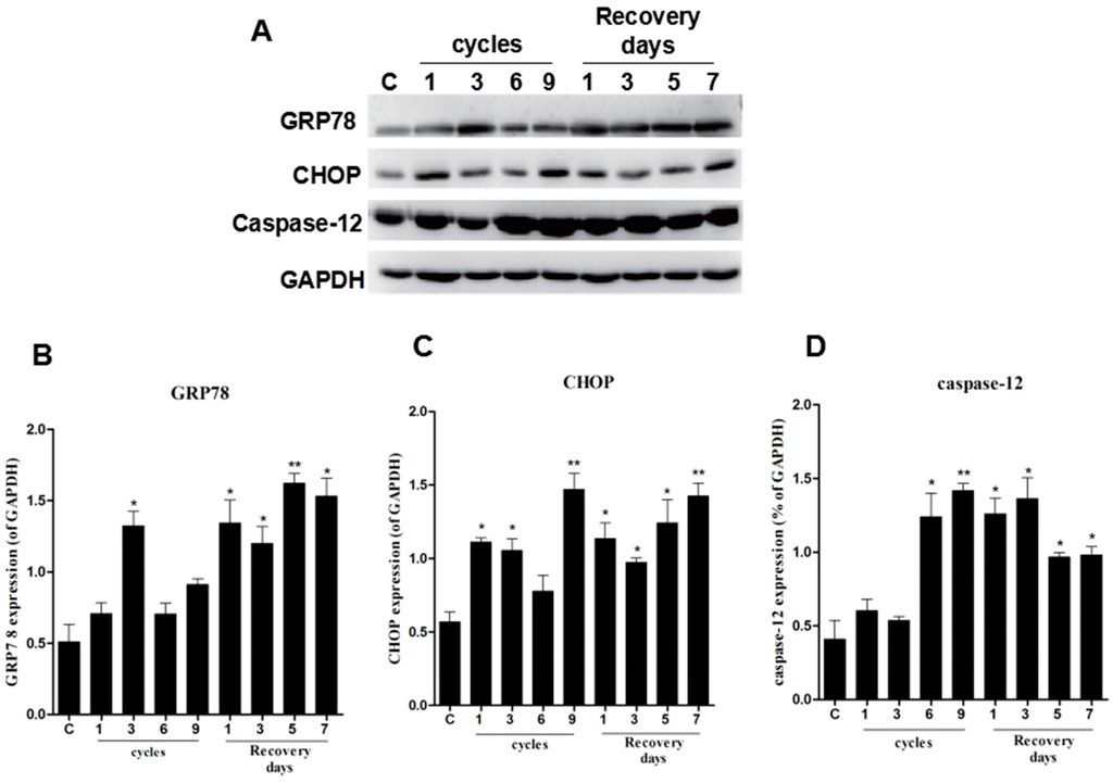 ER stress is an important cause of cell differentiation, damage, and apoptosis []. In our study, glucose-regulated protein 78 (GRP78), CHOP, and caspase-12 were used to monitor the ER stress response to cell damage. After compression and I/R treatment, the onsite protein expression levels of GRP78, CHOP, and caspase-12 increased compared to the control group. GRP78 and CHOP levels were remarkably increased, showing dependence on both the compression cycles and recovery days (Figure 4A–C). Although the levels of caspase-12 increased after compression and I/R injury, caspase-12 levels were lower in the recovery group on days five and seven (Figure 4A,D). These data suggest that the cell death signaling pathway is triggered by ER stress.