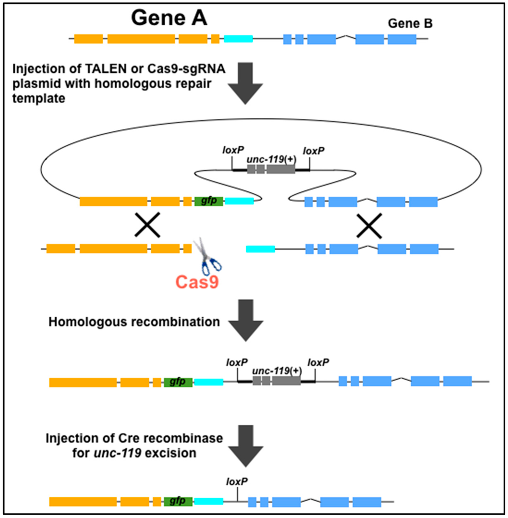 Schematic of homologous recombination-mediated gfp insertion using TALENs or Cas9. The unc-119(+) selection marker in the resulting gfp-inserted worms can be excised by injecting Cre recombinase. The orange, blue, and cyan genomic regions are gene A, the 3’ UTR of gene A, and gene B, respectively. The figure was adapted from Dickinson et al. [40].