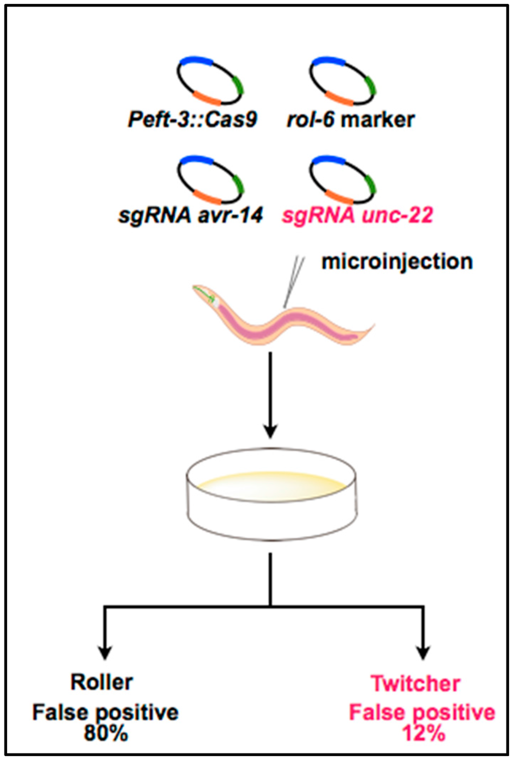 Overview of the co-CRISPR strategy for efficiently identifying functional sgRNAs targeting avr genes. sgRNA targeting unc-22, a gene associated with the twitcher phenotype, was co-injected with sgRNAs targeting avr-14 and avr-15, the Cas9 expression vector, and the rol-6 transformation marker. The co-injection of a functional unc-22 sgRNA reduced the false-positive rate in the identification of mutants. Figure 2 was adapted from Kim et al. [46].