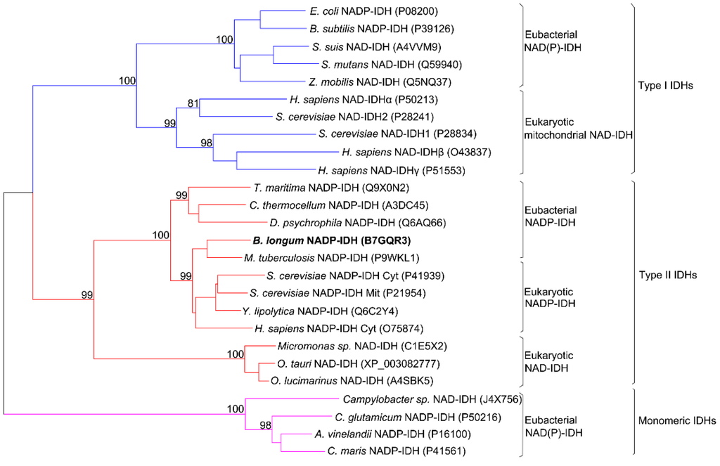 The coding sequence of BlIDH consisted of 1221 bp nucleotides with one open reading frame (ORF) encoding a protein of 406 amino acids. This enzyme showed a high level of sequence similarity to that of Type II NADP-IDHs, such as Mycobacterium tuberculosis IDH (73.5%), Clostridium thermocellum IDH (53.8%) and human cytosolic IDH (61.5%). Phylogenetic analysis was performed to further clarify the evolutionary relationship between BlIDH and other IDHs. The result revealed that BlIDH was clustered into the clade of Type II NADP-IDHs (Figure 1).