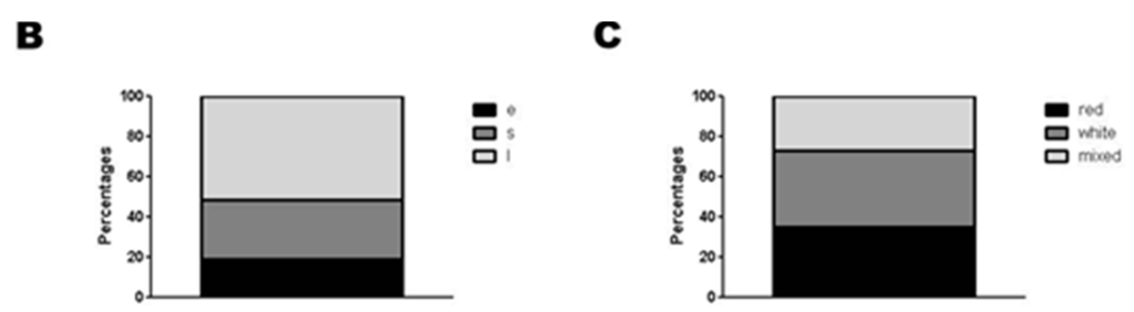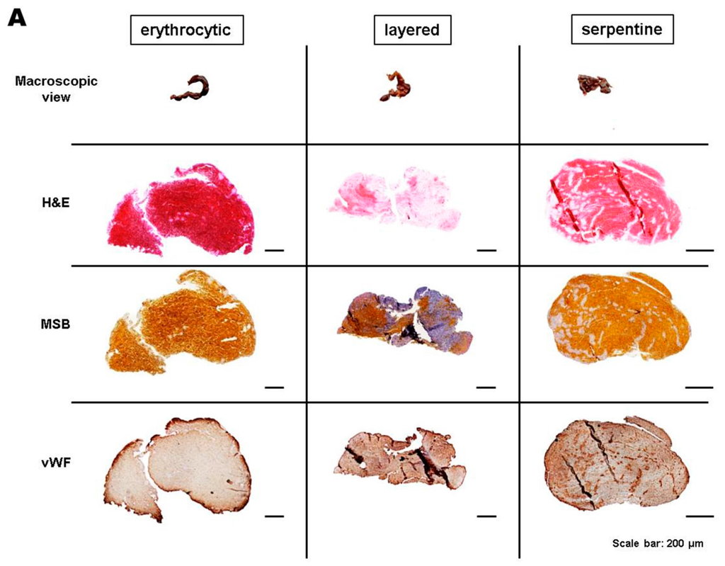 After clinical characterization of patients, we histopathologically categorized the extracted thrombi according to distinctive patterns into erythrocytic (19%), layered (30%), and serpentine (51%) [11], and according to the content of the red blood cells (RBCs) and fibrin/collagen as red (35%), white (38%), or mixed (27%) [12] (Table 1, Figure 1A).