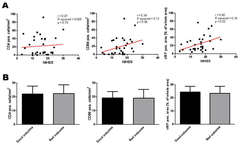 (A) Cellular thrombus histology of all retrieved clots except from the basilar artery in correlation to NIHSS scores at admission and clinical outcome at discharge. Red line: linear regression curve; (B) Categorization of CD4+ T cells, CD68+ monocytes and vWF+ platelets into “Good outcome” (NIHSS score 0–4 or improvement >9 points) or “Bad outcome” at the time of discharge. NIHSS, National Institute of Health Stroke Scale. r = correlation coefficient. R squared = coefficient of determination. p = level of significance.