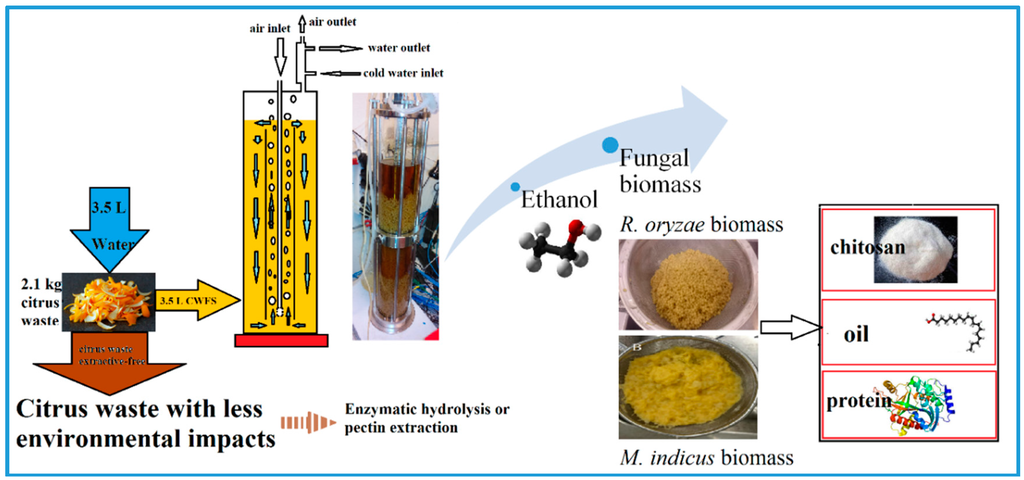 Fungal biomass and ethanol production from citrus wastes (CW) with minimal auxiliary nutrients usage was the main focus of the present study. The fungal biomass and its derivatives contain different value-added chemicals. Schematic of the process, including extraction, cultivation in an airlift bioreactor, and biomass harvesting, is shown in