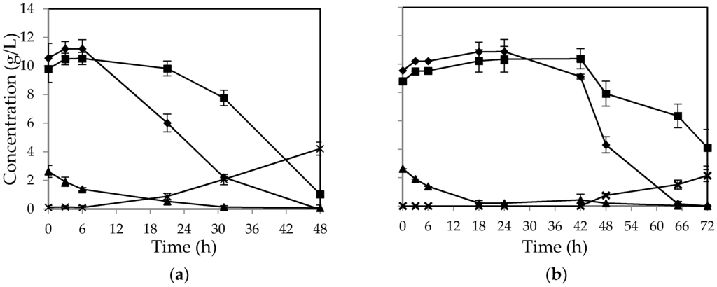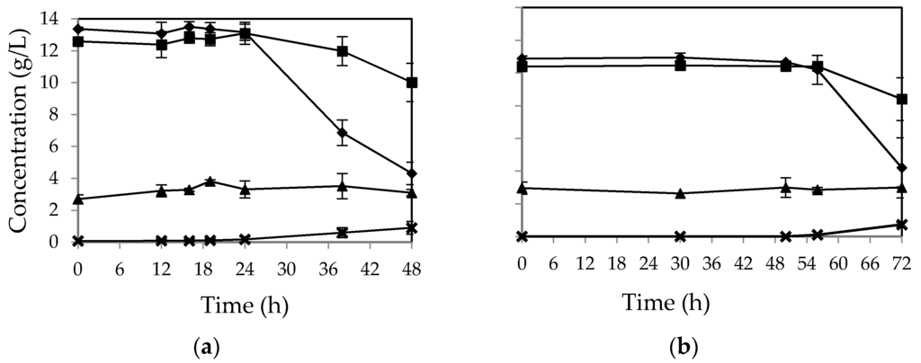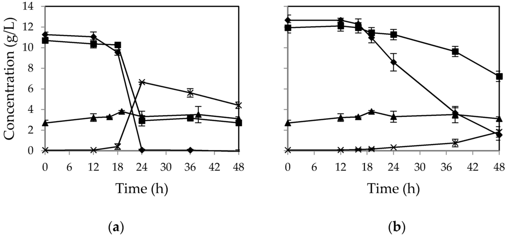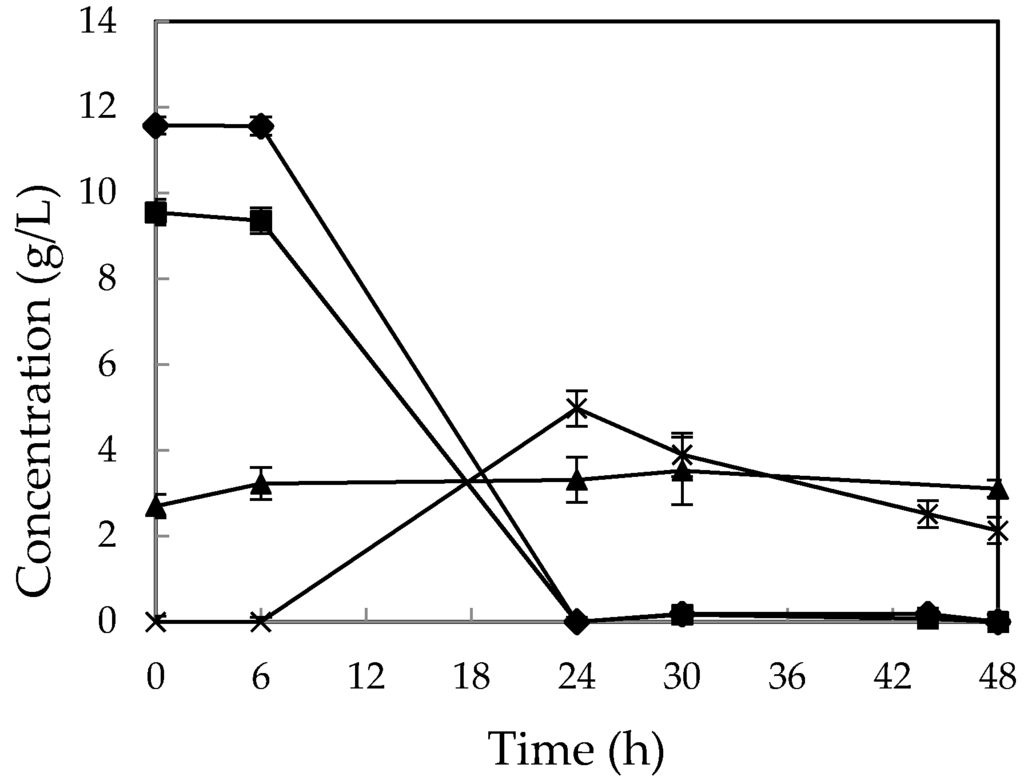 Figure 3b). No change in sucrose concentration was observed during cultivation; however, sucrose was partially hydrolyzed to glucose and fructose during autoclaving, which had a low pH (pH~4.1). The maximum ethanol yield was obtained after 24 h from
