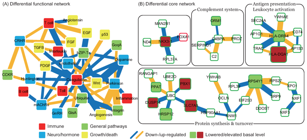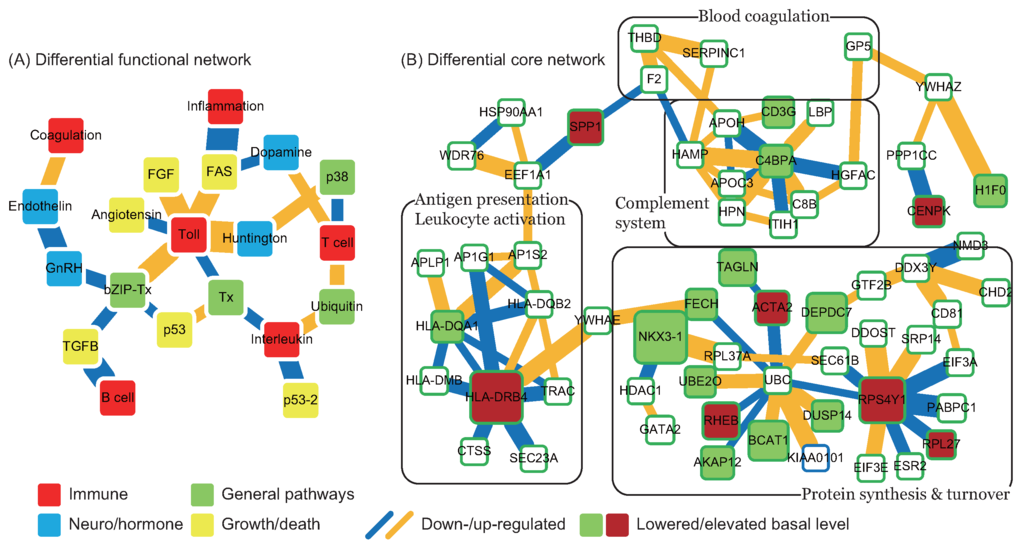 ). In addition to miRNA regulation of protein basal levels, methylation regulation is a potential mechanism that can change protein basal levels after stroke onset. Although studies of methylation in strokes have indicated a range of changes in protein basal level [33], the targets of methylation regulation have not yet been the subject of a dedicated study. Proteins that have large basal level changes and are not miRNA targets (ACTA2 [34], C4BPA [35], CD3G [36], CENPK [37], DEPDC7 [38], FECH [39], HLA-DQA1 [40], HLA-DRB4 [41], and NKX3-1 [42]) can be potential targets of methylation regulations. Based on the specific targets of miRNA regulations and the position of the target proteins in the core networks, several potential drug targets can be selected (* in Table 2). SPP1 in blood coagulation bridges the complement systems and antigen presentation, and the connection can activate the subsequent inflammation and immune responses. In addition, SPP1 can also activate IFNγ and IL12, making it a potential treatment candidate. Another potential target is RPS4Y1, a male-specific protein that may play a role in males’ higher susceptibility to stroke. Finally, the possibility that the targets of miRNA and methylation regulation are identical cannot be ruled out and there are other factors may cause the changes of protein basal levels, such as differential gene regulations through transcription factors. The mechanisms of miRNA and methylation regulations after CE stroke onset require further investigation in future studies.3. Material and Methods