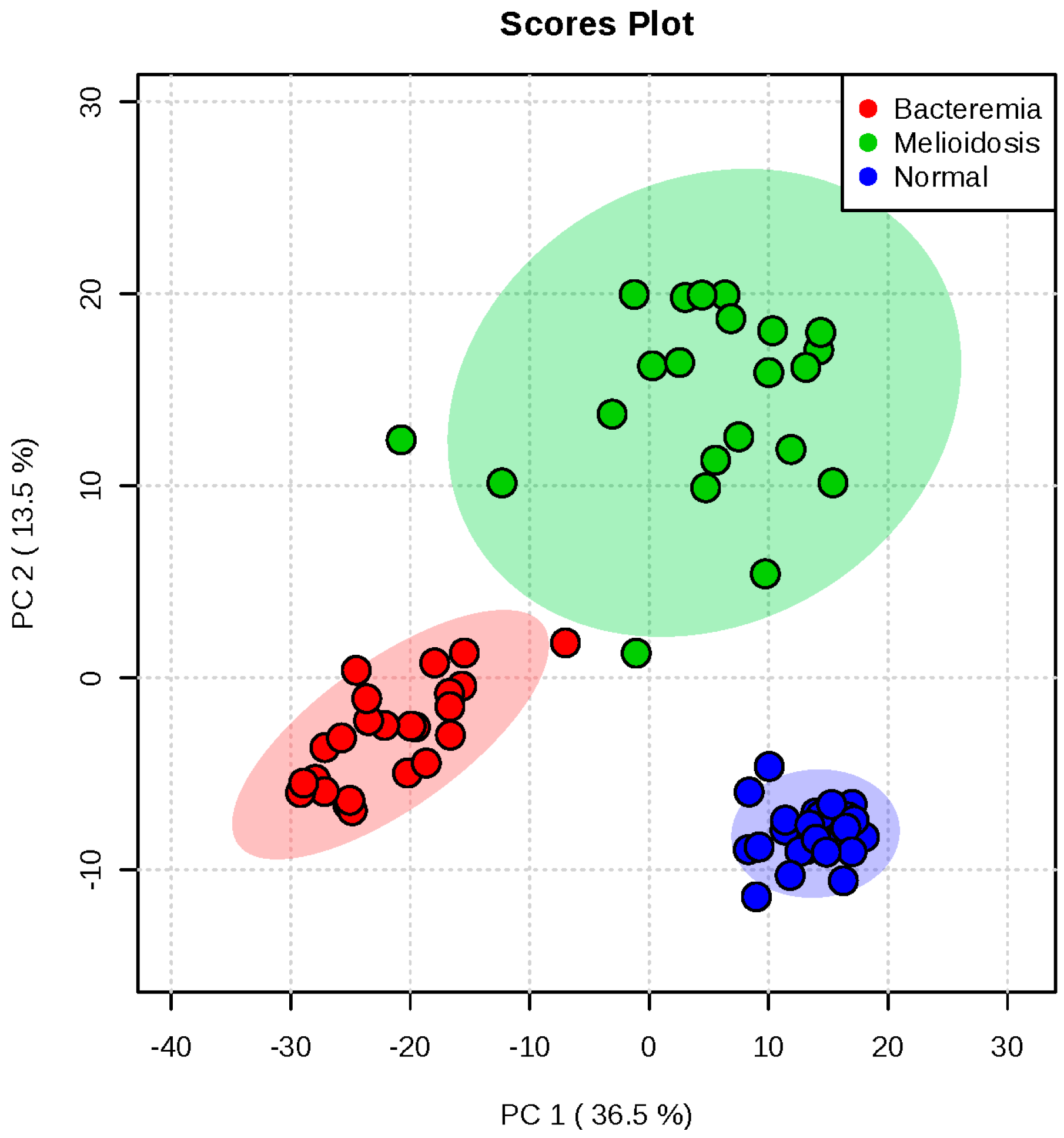 Principal component analysis (PCA) score plot in positive mode based on human plasma of 22 melioidosis, 24 bacteremia and 30 controls without active infection. The PCA score plots showed that samples from melioidosis patients, bacteremia patients and controls without active infection were clustered separately.