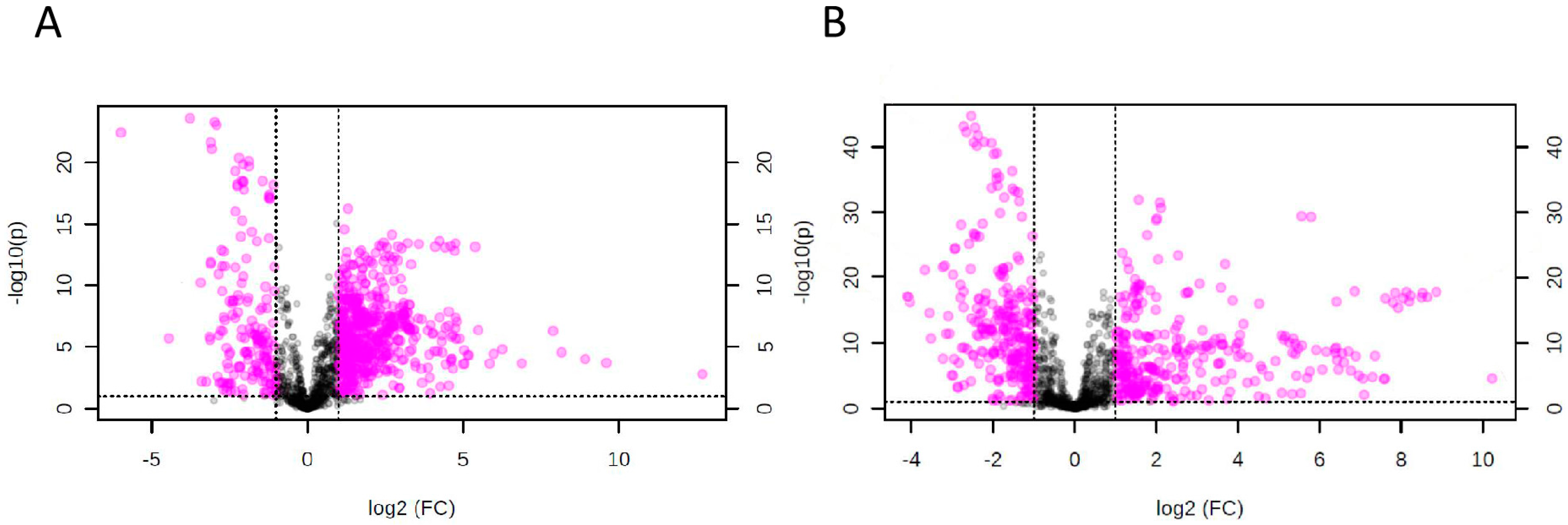 Volcano Plot, using fold-change (FC) >1.5 and p-values cut-off <0.05 using Student’s t-test. The statistical analyses were performed for comparison between melioidosis and bacteremia patients in (A) positive mode as well as melioidosis patients and controls without active infection in (B) positive mode.