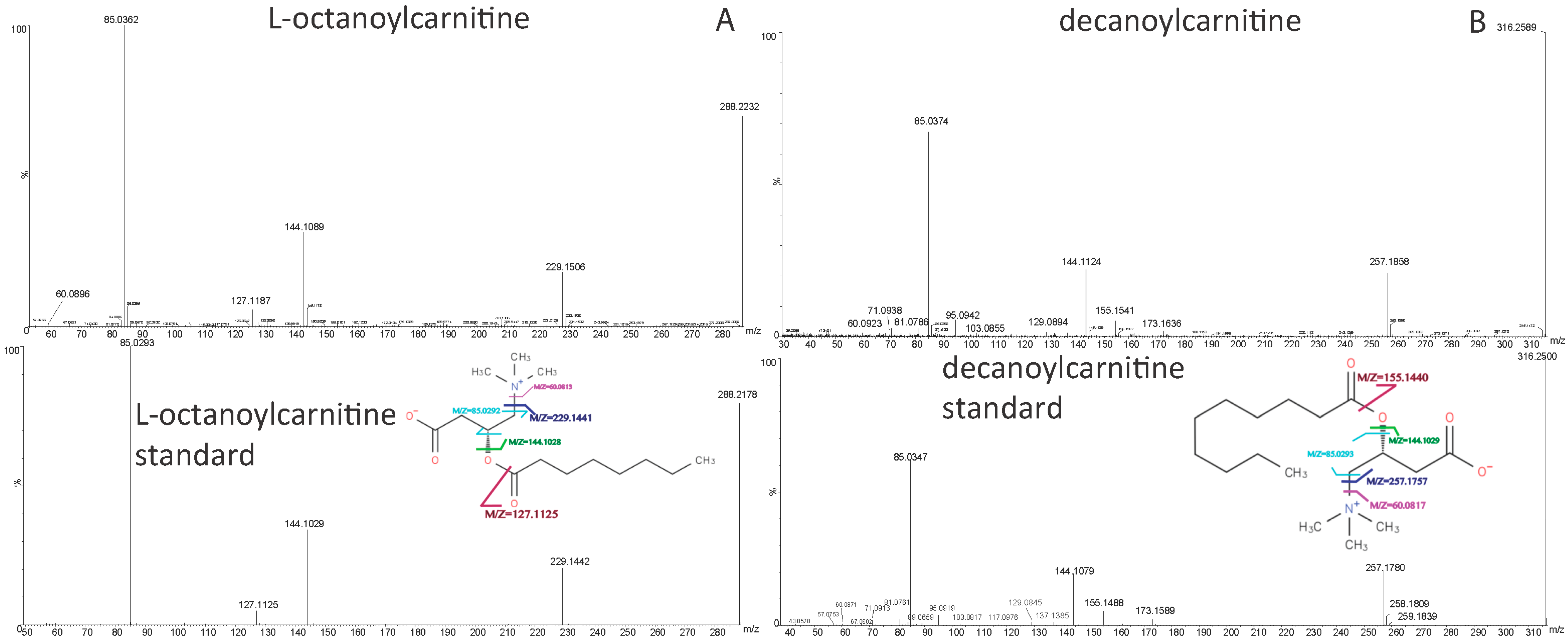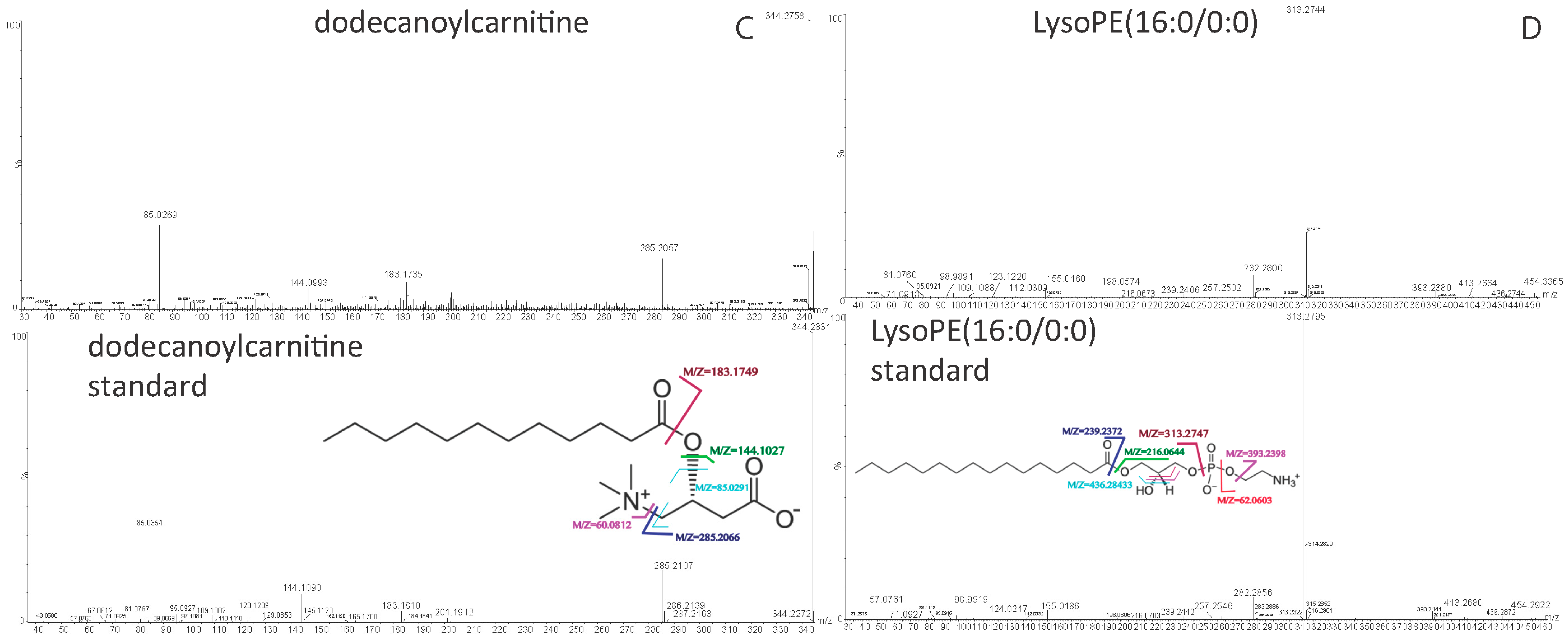 Features with significant differences were selected for product ion scanning (PIS) experiments. MS/MS spectra for the potential biomarkers and commercially available reference standards, including decanoylcarnitine, decanoylcarnitine, l-octanoylcarnitine, LysoPE(16:0/0:0), LysoPE(18:0/0:0) and PC(16:0/16:0), were processed using Agilent MassHunter Qualitative Analysis software (version B.05.00, Agilent Technologies, USA) to generate potential molecular formula based on the accurate mass and isotopic pattern recognitions of parent and fragment ions. All putative identities were confirmed by matching with entries in the METLIN database [59], Human Metabolome Database (HMDB) [60], MassBank [61], LipidMaps [62], KEGG (Kyoto Encyclopedia of Genes and Genomes) database [63] using exact molecular weights, nitrogen rule or MS/MS fragmentation pattern data and literature search. Efforts were made to distinguish metabolites from the other isobaric compounds whenever possible by its elution order and virtue of difference in fragmentation pattern corresponding to its structural characteristics. Putative identities of six biomarkers were confirmed by comparing their chromatographic RT and MS/MS spectra with those obtained from commercially available standards of decanoylcarnitine, decanoylcarnitine, l-octanoylcarnitine, LysoPE(16:0/0:0), LysoPE(18:0/0:0) and PC(16:0/16:0). The collision energy was set at 20 eV for generating the MS/MS spectra.