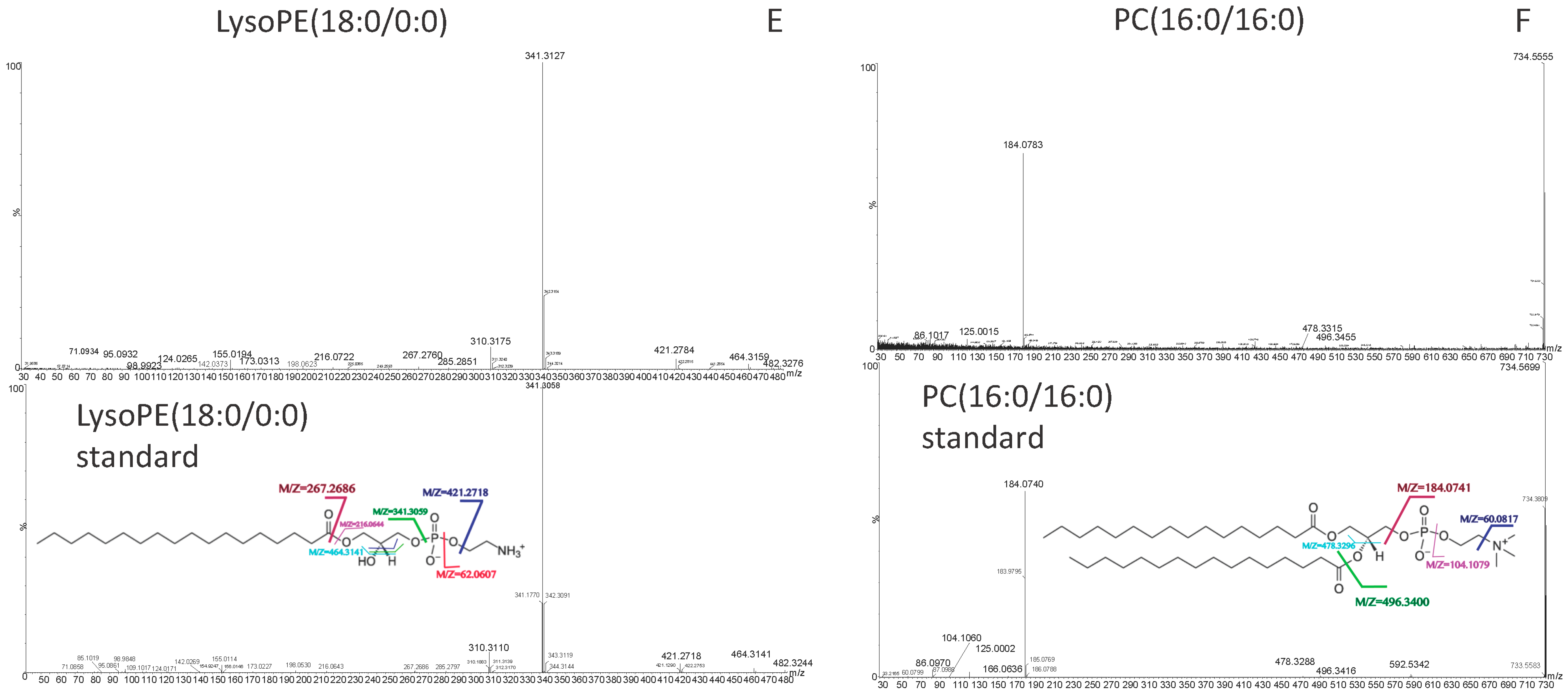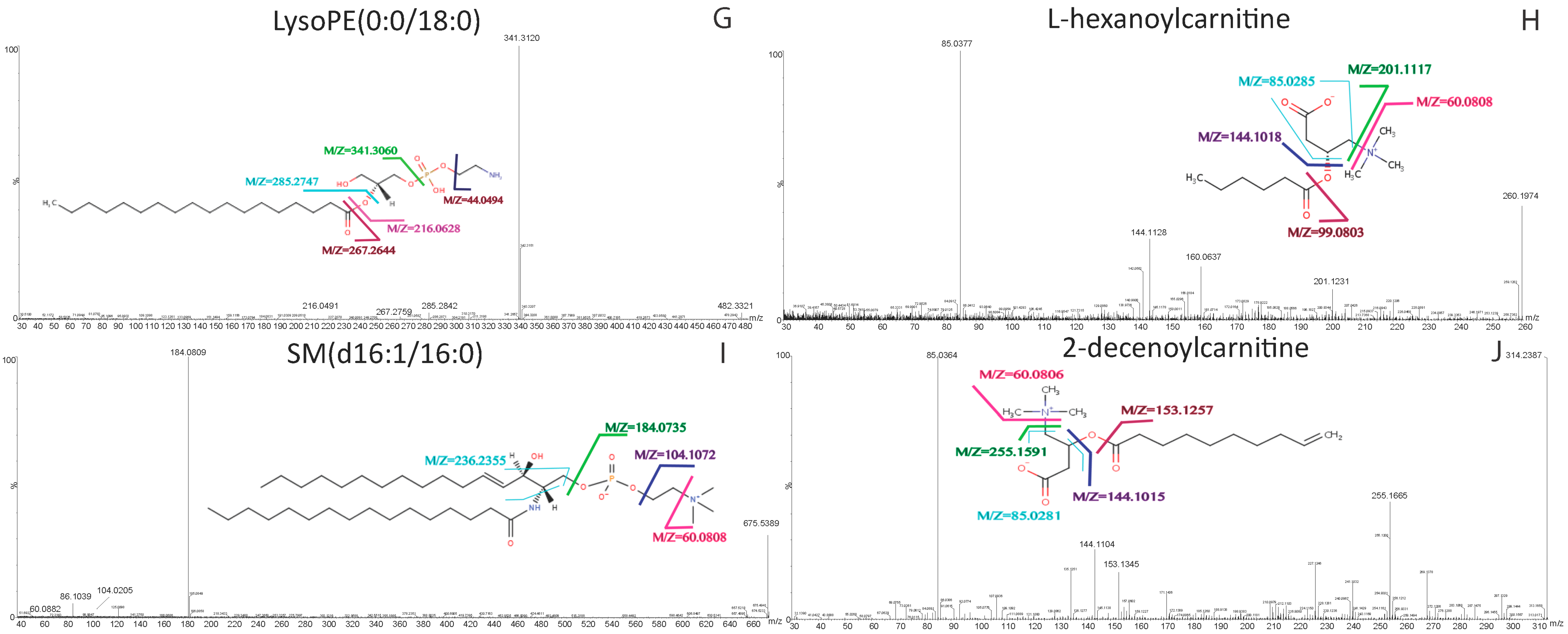 LC-MS grade water, methanol and acetonitrile were purchased from J.T. Baker (Center Valley, PA, USA). High-performance liquid chromatography (HPLC)-grade ethanol and acetone were purchased from Merck & Co. (Kenilworth, NJ, USA). Formic Acid was of American Chemical Society (ACS) reagent grade from Sigma-Aldrich (Saint Louis, MO, USA). Decanoylcarnitine, LysoPE(16:0/0:0), LysoPE(18:0/0:0) and PC(16:0/16:0) was purchased from Avanti Polar Lipid (Alabaster, AL, USA). Decanoylcarnitine and l-octanoylcarnitine were purchased from Sigma-Aldrich (Saint Louis, MO, USA).
