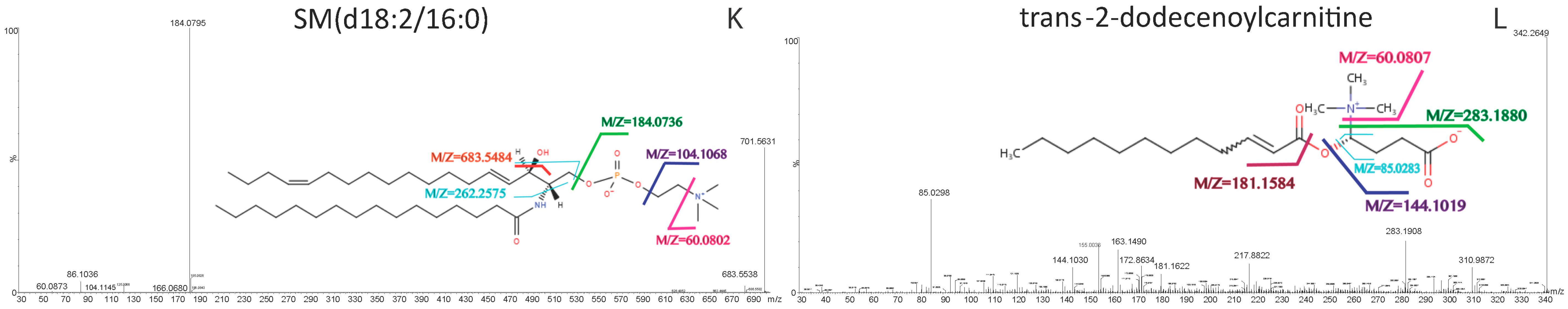 MS/MS mass spectra and predicted structures with expected fragmentation profiles of the 12 biomarkers in melioidosis patient plasma: (A) l-octanoylcarnitine; (B) decanoylcarnitine; (C) dodecanoylcarnitine; (D) lysophosphatidylethanolamine (LysoPE)(16:0/0:0); (E) LysoPE(18:0/0:0); (F) phosphatidylcholine PC(16:0/16:0); (G) LysoPE(0:0/18:0) (H) l-hexanoylcarnitine; (I) sphingomyelins SM(d16:1/16:0); (J) 2-decenoylcarnitine; (K) SM(d18:2/16:0); and (L) trans-2-dodecenoylcarnitine with or without comparison to commercially available standards.