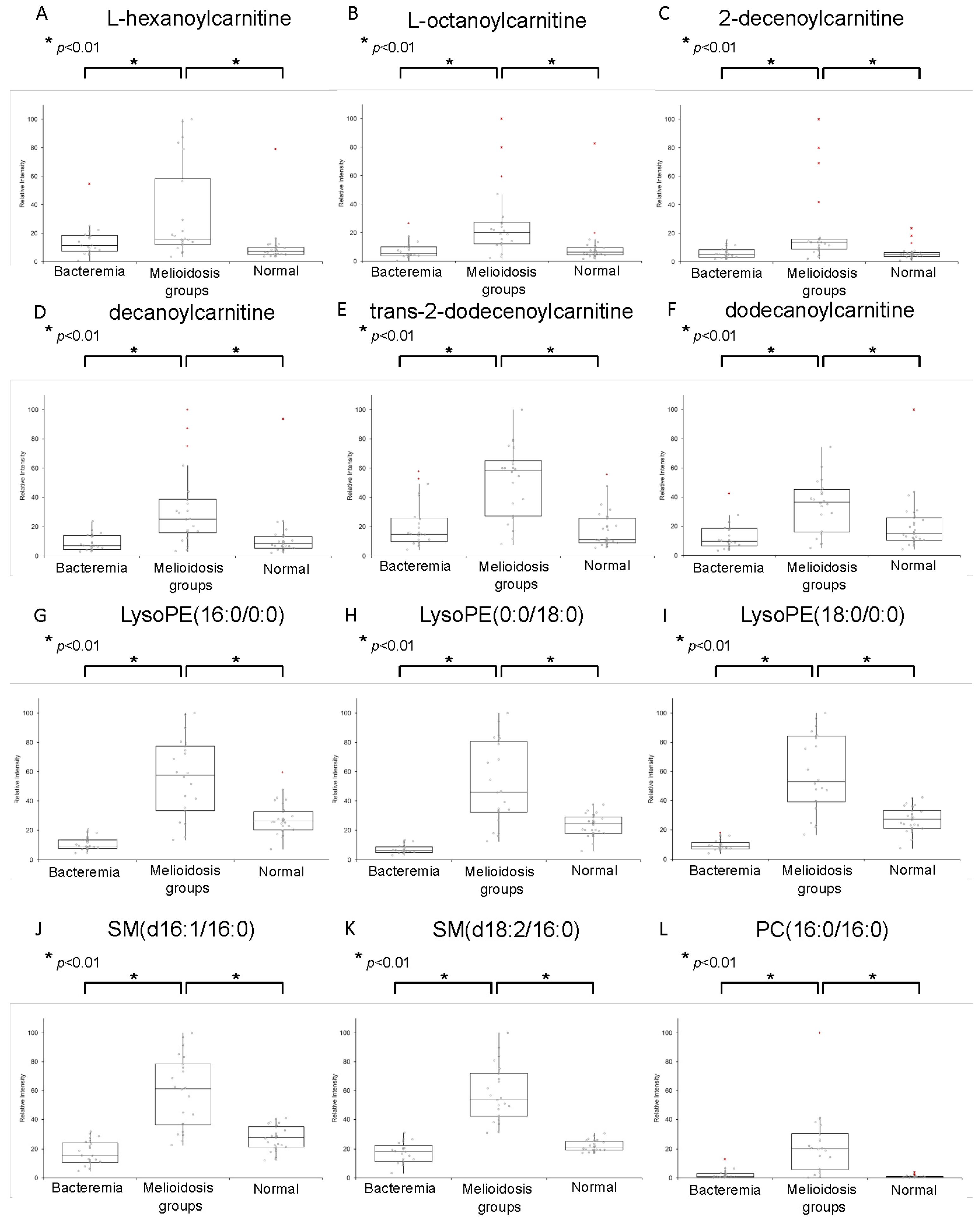 Box-and-whiskers plots representing relative abundance of: (A) l-hexanoylcarnitine; (B) l-octanoylcarnitine; (C) 2-decenoylcarnitine; (D) decanoylcarnitine; (E) trans-2-dodecenoylcarnitine; (F) dodecanoylcarnitine; (G) LysoPE(16:0/0:0); (H) LysoPE(0:0/18:0); (I) LysoPE(18:0/0:0); (J) SM(d16:1/16:0); (K) SM(d18:2/16:0); and (L) PC(16:0/16:0) in plasma of melioidosis patients, bacteremia patients and controls without active infections. The relative abundance of each metabolite in plasma of melioidosis patients was significantly higher than the other two groups using Student’s t-test (p-value < 0.01).