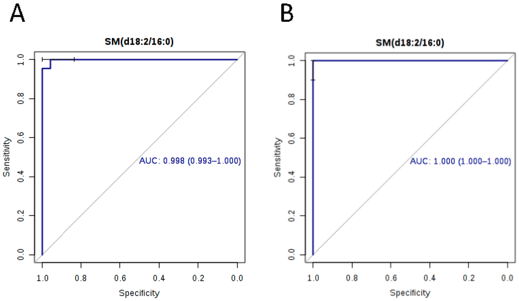 | SM(d18:2/16:0) | 0.998 | 0.993–1.000 | 100.0 | 91.7 | 1.88 × 10−12 | 3.32 ↑ | 1.000 | 1.000–1.000 | 96.7 | 100.0 | 1.28 × 10−13 | 2.65 ↑ |