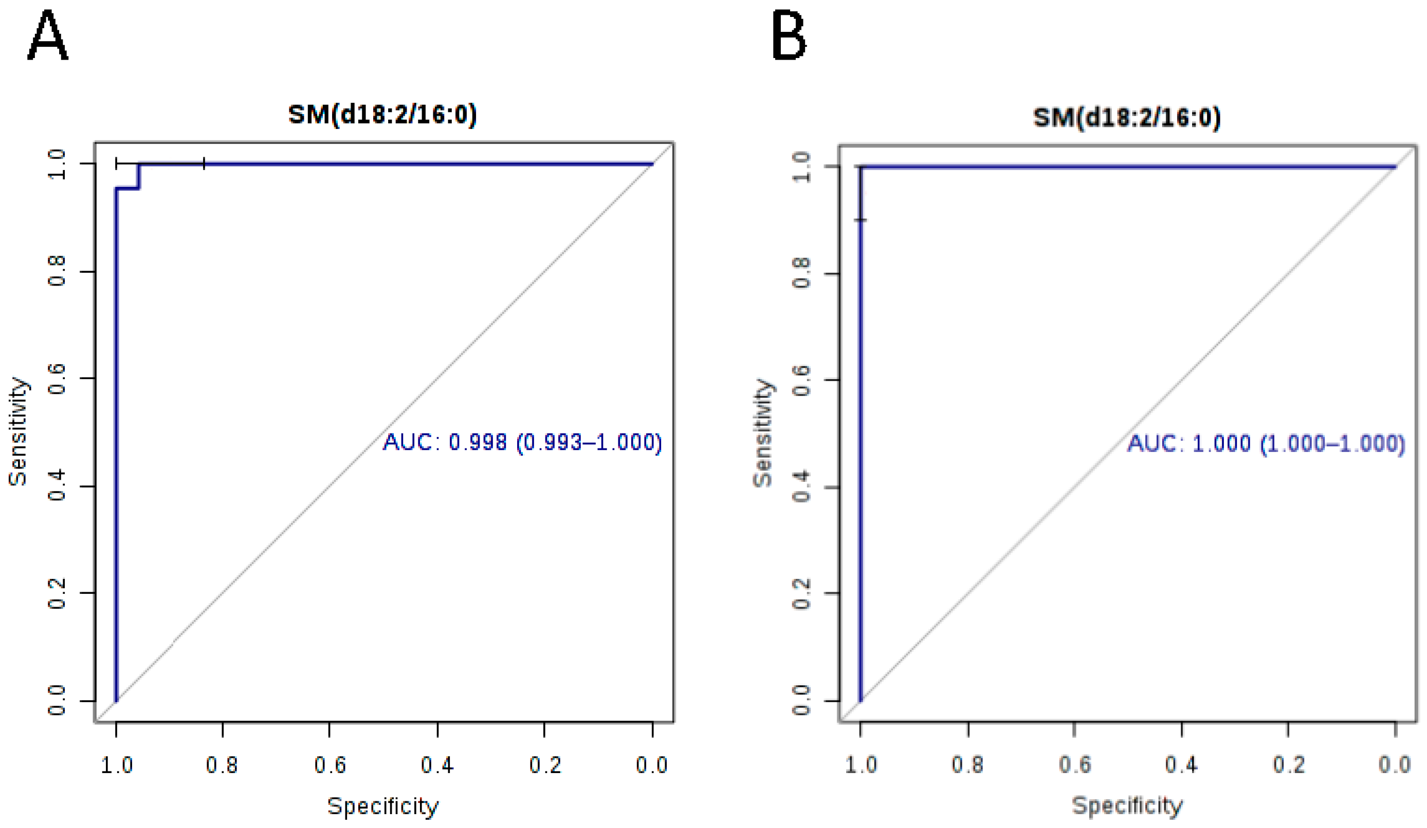 The AUC, sensitivity and specificity for ROC curves calculated for the 12 metabolites at optimal cutoffs are summarized in Table 2. Box-whisker plots revealed that they all exhibited significantly higher levels in plasma samples of melioidosis patients than in samples of patients with other bacteremia and controls (p < 0.01 by Student’s t-test) (Figure 4). Among the 12 biomarkers, 10 showed AUC > 0.80 when compared both between melioidosis and bacteremia patients, and between melioidosis patients and controls. SM(d18:2/16:0) possessed the largest AUC when compared both between melioidosis patients and patients with other bacteremia (AUC 0.998, sensitivity 100% and specificity 91.7%), and between melioidosis patients and controls (AUC 1.000, sensitivity 96.7% and specificity 100%) (Figure 5).