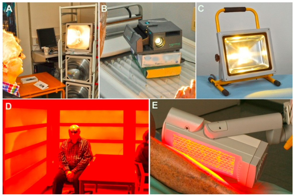 The five different light sources. (A) Overhead projector; (B) Slide projector; (C) White light-emitting diode (LED) lamp; (D) Red LED panel; (E) Red LED lamp.