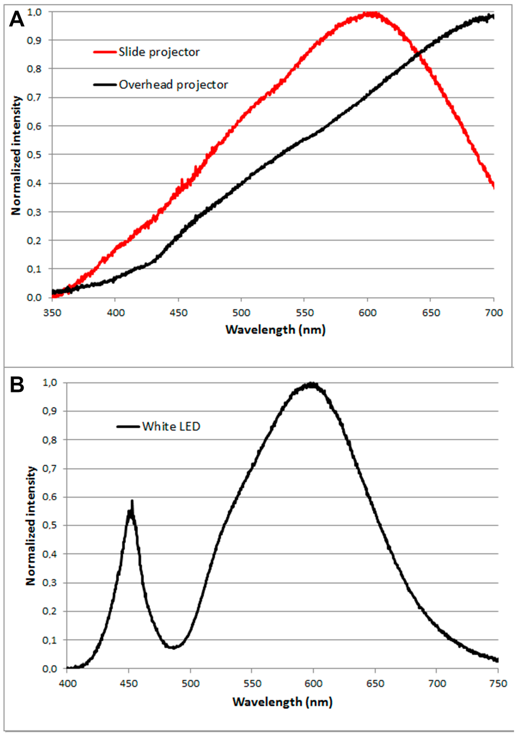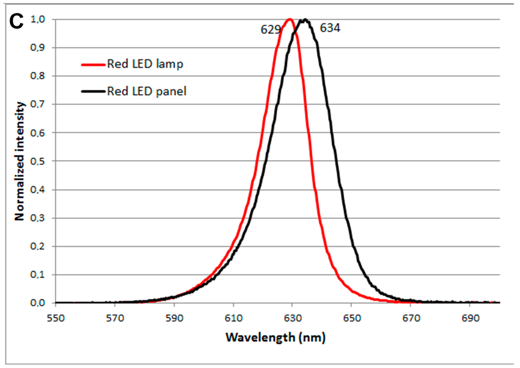 The spectra of the lamps were recorded at different distances using a spectroradiometer (Jaz, Ocean Optics, Florida, FL, USA). Illuminance was measured with a lux meter, model E2 (Hagner, Solna, Sweden). We used the following five light sources: (1) a slide projector (Kindermann GmbH, Eibelstadt, Germany) model Silent 2500, which is mounted with a 250-W halogen light bulb. Light from the light bulb shines through the empty slide holder, condenser lenses and the projection lens. A concave mirror behind the lamp also helps to direct the light. The slide projector has a heat filter, which makes the spectrum above 630 nm different from that of the overhead projector; (2) an overhead projector (Medium GmbH, Düsseldorf, Germany), model OHP 536. It is mounted with a 400-W halogen light bulb. An overhead projector is similar to the slide projector. Normally, after the light leaves the projection lens, an angled plane mirror reflects and reverses the image so it appears right-side up on a vertical projection screen (mirror dismantled). The light from the lamp is directed towards the projection lens by a plastic lens of the Fresnel type placed beneath the glass plate on top of which the transparency is placed; (3) a white LED lamp (Nor-tec, Kolding, Denmark) model 74,643 with a 50-W LED emitter; (4) an LED panel with diffuse light consisting of four panels of 30 cm × 120 cm (Cada Light, Shenzhen, China) model BL-PL 1203-18W, in which each panel is 18 W; (5) the red LED lamp often used for conventional PDT (Photocure ASA, Oslo, Norway) model Aktilite CL 128 140 W.
