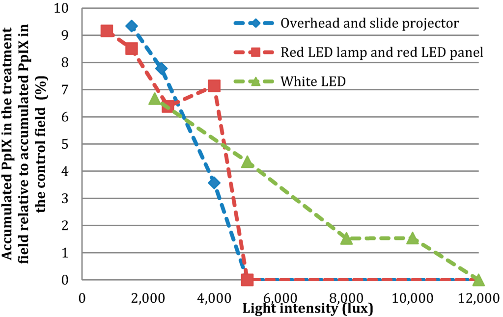 The overhead projector was the light source with the highest fluence rate of 1.14 mW/cm2 (PpIX-weighted) corresponding to 8.2 J/cm2. The slide projector resulted in a fluence rate of 0.17 mW/cm2 (PpIX-weighted) corresponding to 1.2 J/cm2 in two hours. The white LED lamp resulted in a fluence rate of 0.03 mW/cm2 (PpIX-weighted) corresponding to 0.2 J/cm2 in two hours and the red LED panel also resulted in a fluence rate of 0.03 mW/cm2 (PpIX-weighted) corresponding to 0.2 J/cm2 in two hours.