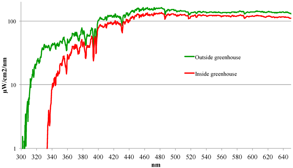 The greenhouse is constructed of one layer window glass with acrylic at the very top (Figure 5). A UV dosimeter [14] was continuously measuring ambient UV while the spectroradiometric measurements were performed outside and inside the greenhouse to verify that the ambient light did not change during the measurements. The timespan between the measurements was less than 10 min, so it can be assumed that the solar spectrum did not change. The effect of the greenhouse glass was calculated by comparing the two spectroradiometric measurements.