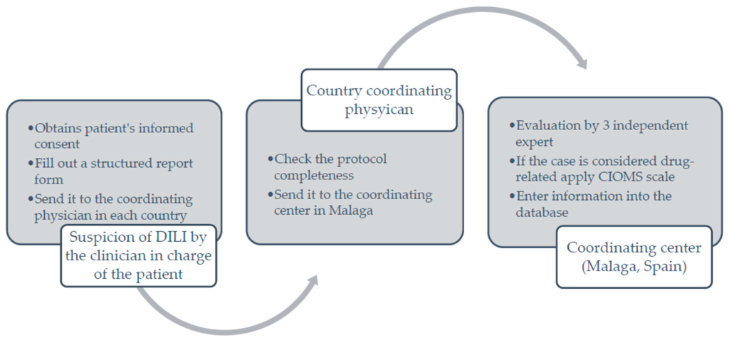 The Asociación Latinoamericana para el Estudio del Hígado (ALEH) (Latin American Association for Liver Study) has supported and accompanied this project since the very beginning, providing the group with a top place in its Website (available online: http://www.alehlatam.org) []. The physicians contacted and committed to the project are responsible for spreading it in their respective countries, and for generating—by using the resources most suitable to their local situations—an internal training network for possible DILI cases. Based on the suspicion of DILI, and having the patient’s informed consent following the Spanish model, the treating clinician fills out a standardized form that is sent to the coordinating physician in each country for a first evaluation, and then to the coordinating center in Malaga, Spain. There, the information provided is analyzed, for completeness and the possible association with the drug and drug-drug interactions is evaluated. The causes that were excluded are discussed and, finally, after being evaluated by three independent experts, the event is adjudicated, or not (Figure 1). Hepatitis E virus (HEV) may usually represent a diagnostic problem. HEV determination was carried out in those cases where both clinical context and endemic area have suggested to us a high epidemiological impact of the virus. We are conducting a study analyzing all DILI samples to detect the true incidence of Hepatitis E in this population.