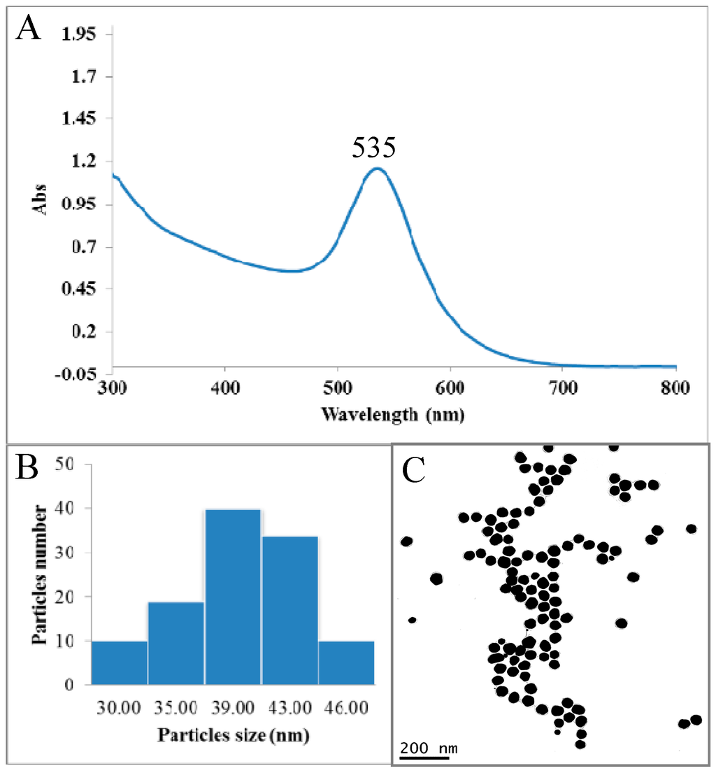 Transmission Electron Microscopic (TEM) images were obtained on a JEOL 1400 TEM (JEOL, LTE, Tokyo, Japan). The absorption measurements were made using a Varian Cary 50 UV-Vis spectrophotometer, Shimadzu, Columbia, MD, USA. The hydrodynamic diameter and ζ potentials were measured using Zetasizer Nano S90 (Malvern Instruments Ltd., Westborough, MA, USA).