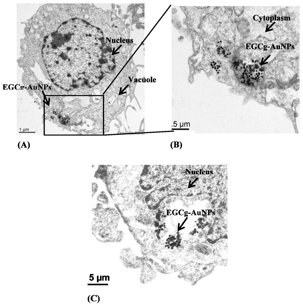 The HUVECs & HCASMCs cells (5 × 105 cells) were seeded into 6 well plates in Media 200/231 separately and allowed to adhere for 24 h in CO2 incubator at 37 °C. The media was replaced with EGCg-AuNPs (10 and 20 μg/mL) containing medium and incubated for 2 h at 37 °C. The cells were washed 12 times with PBS, centrifuged into small pellets, and fixed with 2% glutaraldehyde and 2% paraformaldehyde in sodium cacodylate buffer (0.1 M) and stored at 4 °C for further use. The cells were further fixed with 1% buffered osmium tetraoxide in 2-Mercaptoethanol buffer and dehydrated in graded acetone series and embedded in Epon-Spurr epoxy resin. Sections were cut at 85 nm using a diamond knife (Diatome, Hatfield, PA, USA). The sections were stained with Sato’s triple lead stain and 5% aqueous uranyl acetate for organelle visualization. The cellular samples were examined, for endocytosis of EGCg-AuNPs, on JEOL 1400 TEM microscope (JEOL, Peabody, MA, USA) operated at 80 kV at the Electron Microscopy Core Facility, University of Missouri (Columbia, MO, USA).