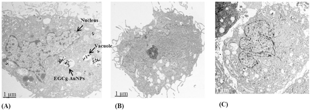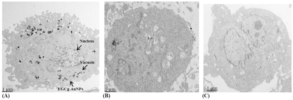 4.6. Cellular Internalization of EGCg-AuNPs by Transmission Electron Microscopic (TEM)