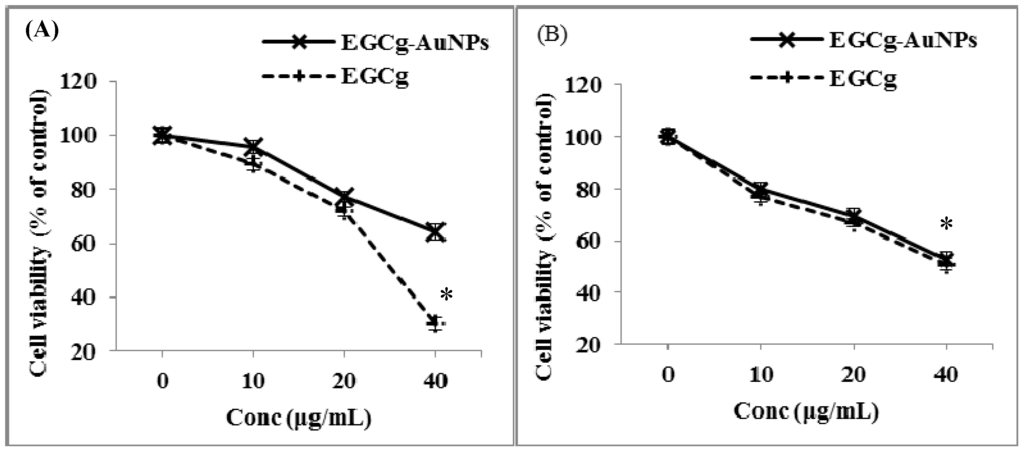 Effect of EGCg-AuNPs and free EGCg on endothelial and smooth muscles cells viability; (means ± SE; n = 3), cells treated for 24 h. (A) HUVECs (Human umbilical vein endothelial cells): * p < 0.05 vs. EGCg-AuNPs at same concentration (40 µg/mL); (B) HCASMCs (Human coronary artery smooth muscle cells): * p > 0.05 vs. EGCg-AuNPs at same concentration (40 µg/mL).