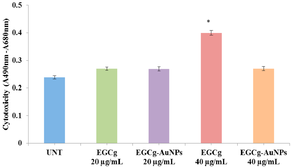 We further investigated the possible cytotoxic effects of the free EGCg and the corresponding EGCg-conjugated gold nanoparticles on endothelial cells through LDH (lactate dehydrogenase) assay. The cytotoxicity was measured in terms of the amount of LDH released from the damaged cells, which is a sensitive marker for cellular toxicity. EGCg induced significant cytotoxic effect as compared to EGCg-AuNPs at concentration of 40 μg/mL (Figure 7).