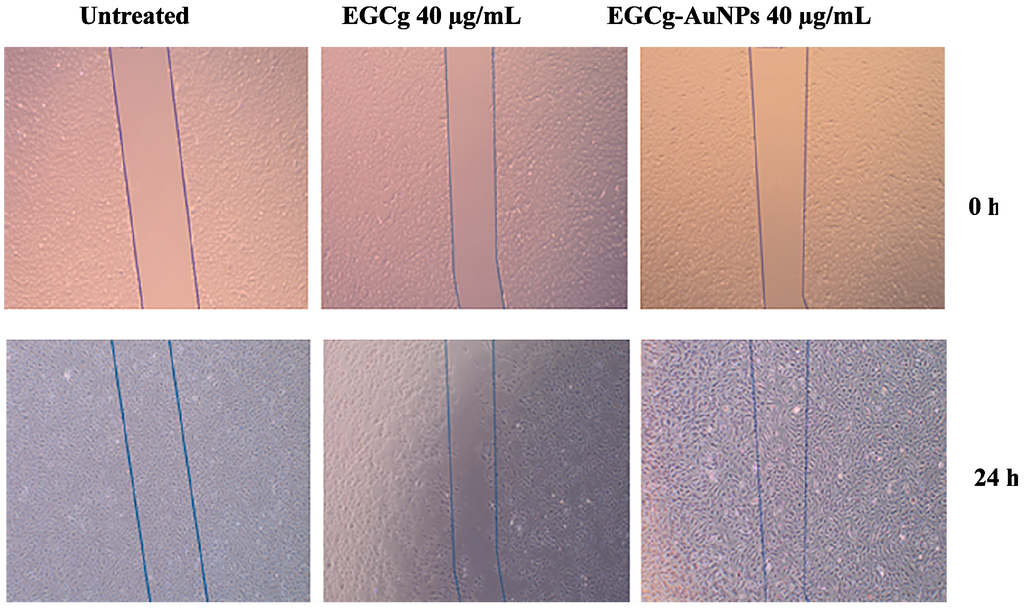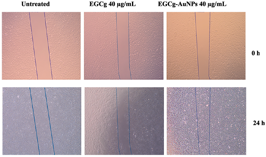 Inhibitory effects of EGCg-AuNPs and free EGCg on human aortic endothelial cells (HAECs) migration. Images were captured at 4× magnification.
