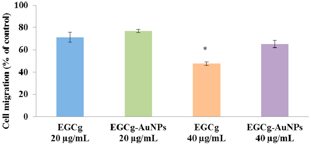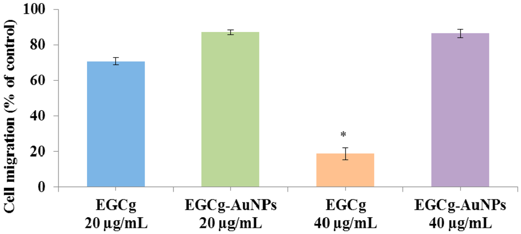 We investigated whether EGCg and EGCg-conjugated gold nanoparticles affect endothelial cell migration. Cells were separately treated with free EGCg and EGCg-AuNPs at concentrations of 20 and 40 μg/mL. EGCg-AuNPs did not significantly inhibit the migration of HAECs, whereas free EGCg significantly inhibited the migration of HAECs by 81% ± 3.4% at the same concentration (Figure 8 and Figure 9). These data are statistically significant and comparable to the control group, where we observed that the scratched area was fully populated with cells within 24 h. These results corroborate that EGCg-AuNPs did not affect the migration of endothelial cells whereas the free EGCg inhibited the migration of endothelial cells at concentration of 40 μg/mL (Figure 9).