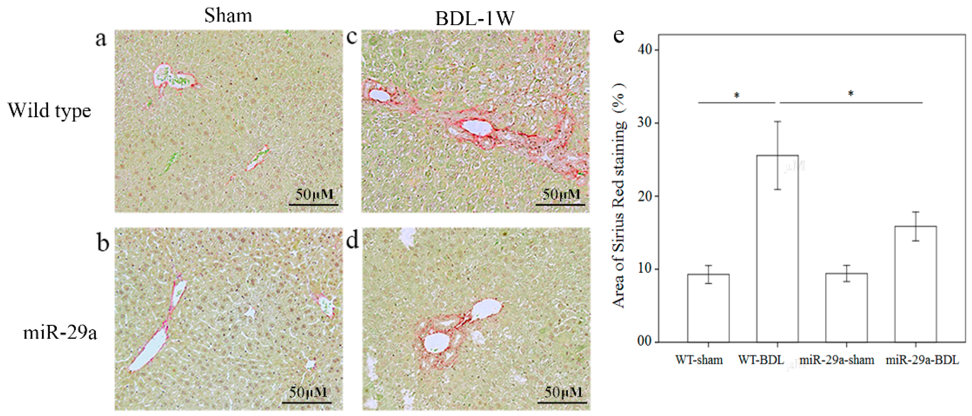 Overexpression of miR-29a in the murine model caused the downregulation of fibrosis in the mice livers following bile duct ligation. Sirius Red staining showed faint fibrosis in both sham operation of wide type (a) and miR-29a Tg mice (b) as well as moderate fibrosis in the –wild type mice (c) and mild fibrosis in the miR-29aTg mice (d), which was limited to the immediate vicinity of the portal area. (e) Data from the three samples per group are expressed as the mean ± SE. * indicates a p < 0.05 between the groups.