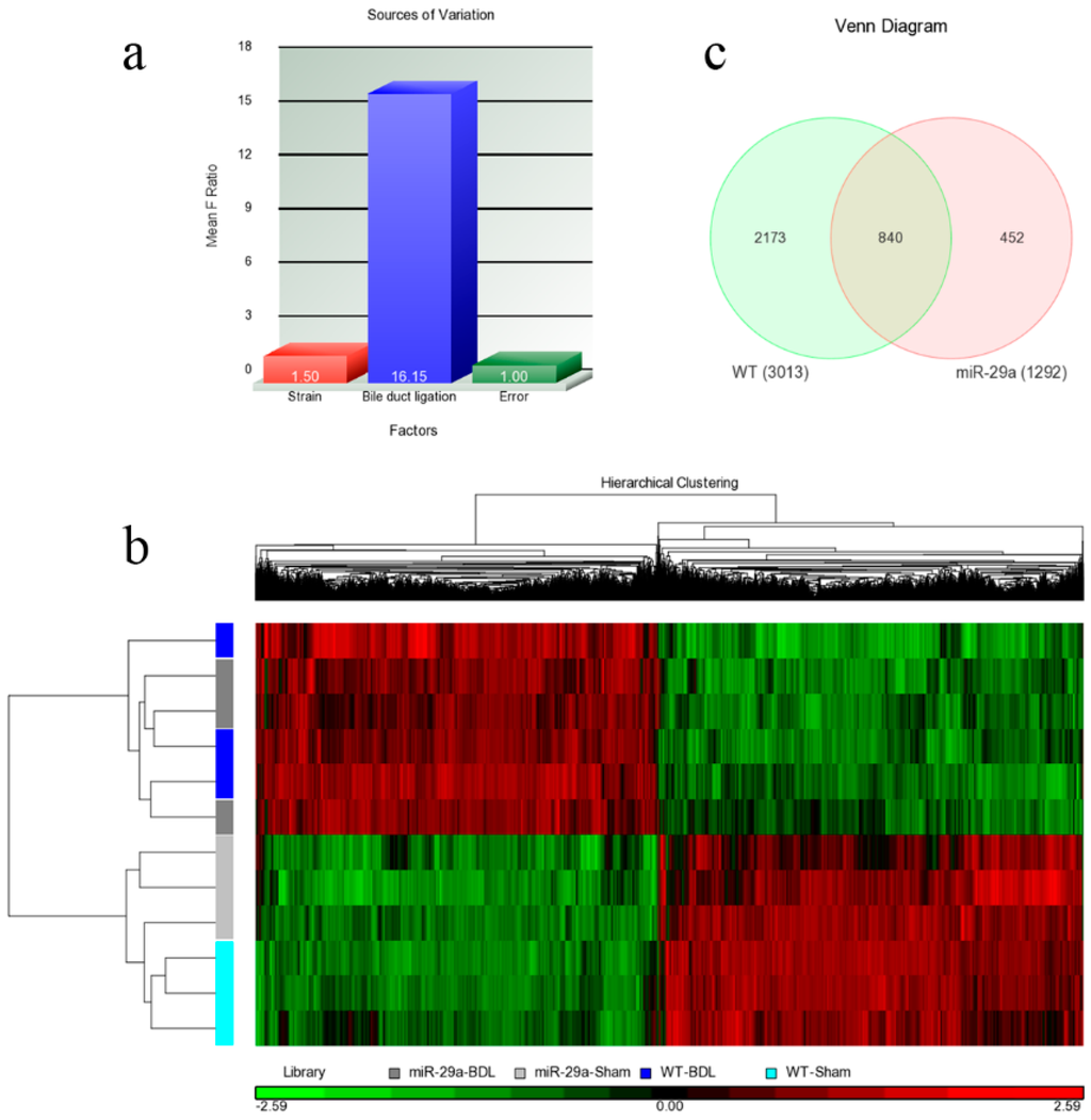 Overall gene expression changes. We used Agilent SurePrint G3 Mouse GE 8 × 60 K microarray chips to study the gene expressions. (a) The source of the variation plot shows that the bile duct ligation factor accounted for most of the variation; (b) The heat map illustrated the clustering of the sample sets; (c) WT denoted the WT-BDL vs. WT-sham comparison, while miR-29a denoted the miR-29a-BDL vs. miR-29a-sham comparison. The digits in the Venn diagram denote the number of DE genes in the set differences and their intersections.