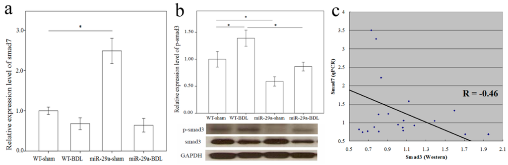 Comparison of the mRNA levels of Smad7 (a) and protein levels of Smad3 (b) expressions in the liver of WT and miR-29Tg mice following bile duct ligation (BDL). Western blot was adopted to study Smad3 activity; (c) We used a scatter plot to demonstrate that Smad7 and Smad3 negatively correlated with Pearson’s correlation coefficient (R = −0.46, p = 0.02). Data from the six samples per group are expressed as the mean ± SE. * indicates a p < 0.05 between the groups.