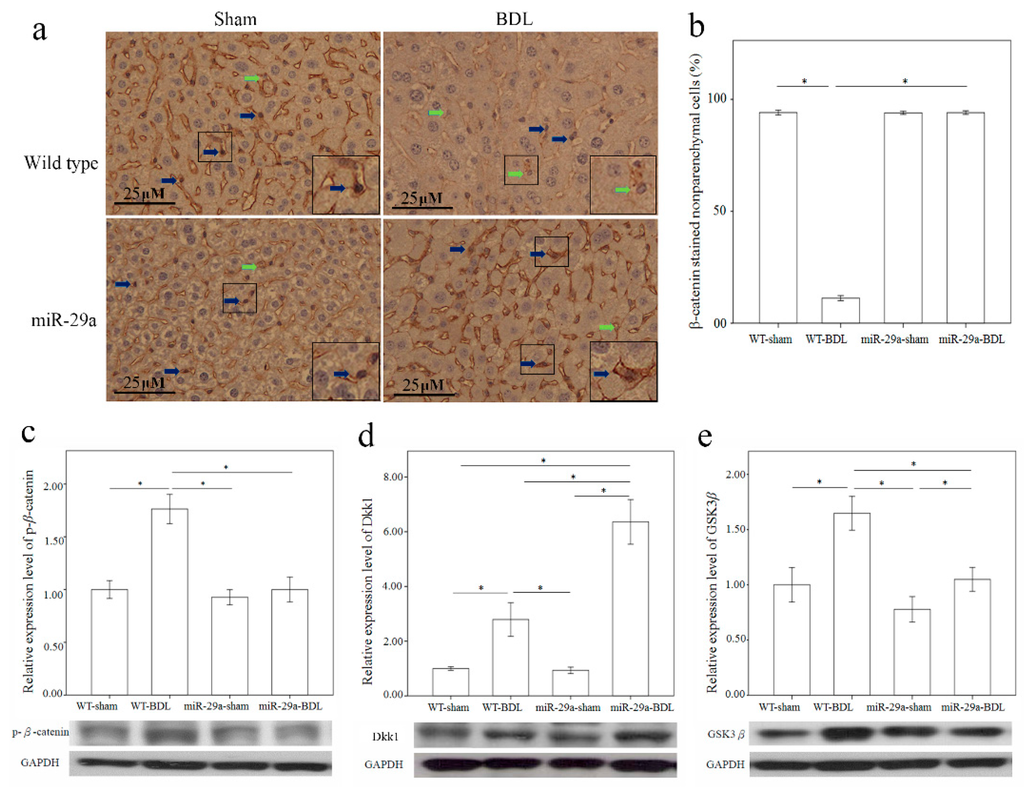 Overexpression of miR-29a in the murine model caused the upregulation of β-catenin (a,b), and Dkk1 (d) as well as the downregulation of phospho-β-catenin (c) and GSK3β (e) in the liver of mice following bile duct ligation. The β-catenin immunoreactivity staining mainly in cytoplasm of hepatocytes and nucleus of the non-parenchymal cells morphologically identical to HSC or Kupffer cells (Figure 4a, inset). Comparing to the sham group of WT mice, which was constantly expressed in the nucleus of the non-parenchymal cells (blue arrow), there was significantly lower β-catenin immunoreactivity (green arrow) in the liver tissues of the BDL group of WT mice (p < 0.001) (Figure 4a,b). Furthermore, miR-29a overexpression significantly upregulated the nuclear β-catenin immunoreactivity in miR-29aTg mice with cholestasis in comparison to WT littermates (p < 0.001). Data are expressed as mean ± SE (standard error) in the six samples from miR-29a transgenic mice and the six samples from their WT littermates. * indicates p < 0.05 between the groups.