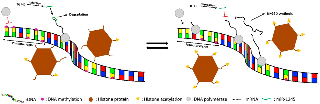Epigenetic regulation of NKG2D. DNA methylation in the promoter region and deacetylated histone 3 lysine 9 (H3K9) suppress gene expression. TGF-β induces miR-1245 leading to a degradation of NKG2D mRNA. If DNA is demethylated and histones are acetylated, gene expression is more pronounced. IL-15, an inducer of NKG2D expression, represses miR-1245 synthesis.