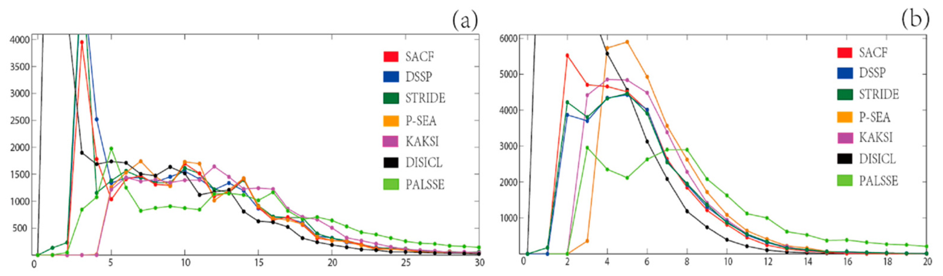 - Martin, J.; Letellier, G.; Marin, A.; Taly, J.F.; de Brevern, A.G.; Gibrat, J.F. Protein secondary structure assignment revisited: A detailed analysis of different assignment methods. BMC Struct. Biol. 2005, 5, 17. [Google Scholar] [CrossRef] [PubMed]