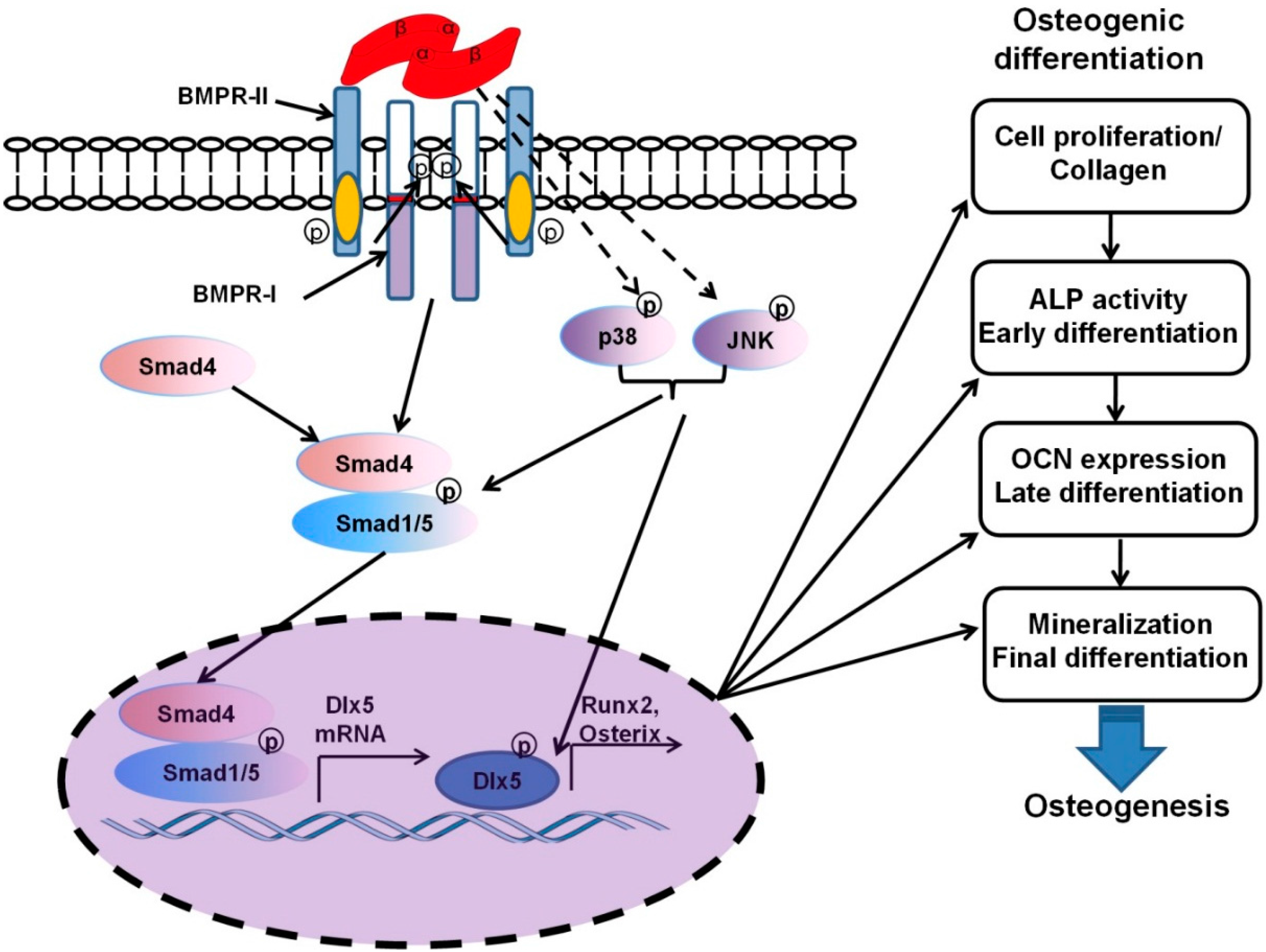 Schematic graphs depicting the signaling pathways of bone morphogenetic proteins (BMPs) and its-induced osteogenic activities. BMPR-I: BMP type I receptors; BMPR-II: BMP type II receptors; Runx2: runt-related transcription factor 2; ALP: alkaline phosphatase; OCN: osteocalcin; Dlx5: distal-less homeobox 5; JNK: c-Jun N-terminal kinase;