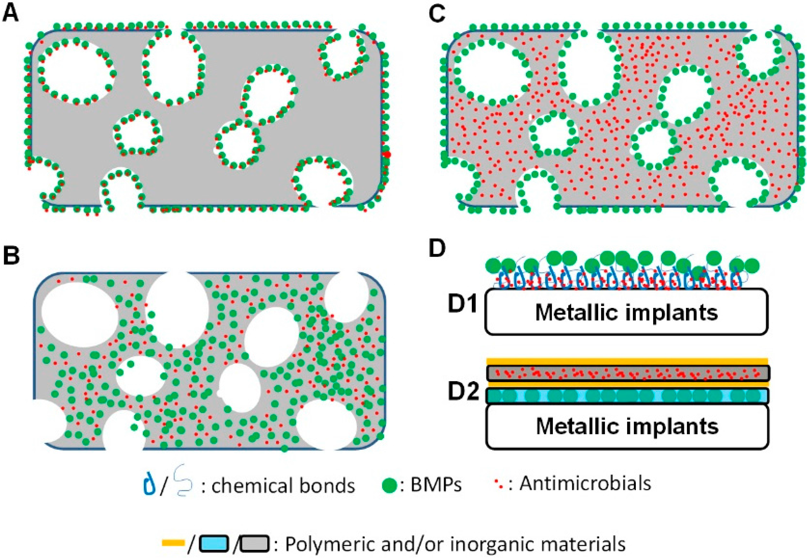 Schematic graph depicting the four different carrying modes of both antibacterial and osteoinductive drugs in biomaterials aiming to treat infected bone defects. (A) Superficial adsorption with or without physicochemical bonds; (B) A co-encapsulation; (C) A mixed carrying mode with encapsulated antibacterial drugs and superficially adsorbed BMPs; (D) surface coatings: (D1) both drugs are immobilized by chemical bonds; (D2) both drugs are encapsulated in coating layers with separation layers for a controlled release.