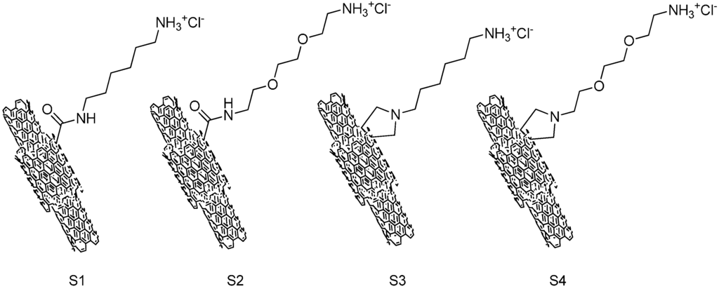 Figure 1 shows the structure of four types of ammonium functionalized multi-wall carbon nanotubes (S1–S4). The synthesis of S1–S4, as well as preparation and purification of the mono-protected diamines compounds, has been previous described [44,45,46]. Briefly, pristine MWCNTs was purified by refluxing with 2 M HCl for 12 h to remove the amorphous carbon particles and metallic catalyst and then suspended in a concentrated mixture acid (H2SO4:HNO3 = 3:1, v/v) at room temperature for 24 h with vigorous stirring to obtain the MWCNTs-COOH. The MWNTs-COCl was obtained by refluxing MWCNTs-COOH with thionyl chloride for 6 h. S1 and S2 were synthesized by stirring MWNTs-COCl with mono-protected diamines in dry dimethyl formamide [44]. S3 and S4 were obtained based on chemical modification of the side wall through 1, 3-dipolar cycloaddition of azomethineylides [45,46]. The BOC-protecting group was removed from the functionalized MWCNTs by stirring with 4 M HCl in CH2Cl2 for 4 h [47]. Then the mixture was filtered and the solid dried at 60 °C to obtain the amino-functionalized MWCNTs. Each type of MWCNTs-NH3+ was dissolved in deionized water at a concentration of 1 mg/mL. All solutions were sonicated for 30 min at room temperature in an ultrasonic bath until dispersed throughout an aqueous phase and then stored at −20 °C until needed.