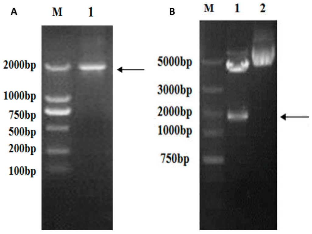 Verification of the vp5 gene. (A) RT-PCR amplification of vp5: lane M, DNA marker; lane 1, vp5 gene; (B) Analysis of the recombinant plasmid: lane M, DNA marker; lane 1, double enzymes digested pEGFP-vp5 with Nhe I and XhoI; lane 2, pEGFP-vp5. Black arrow: the vp5 gene stripe.