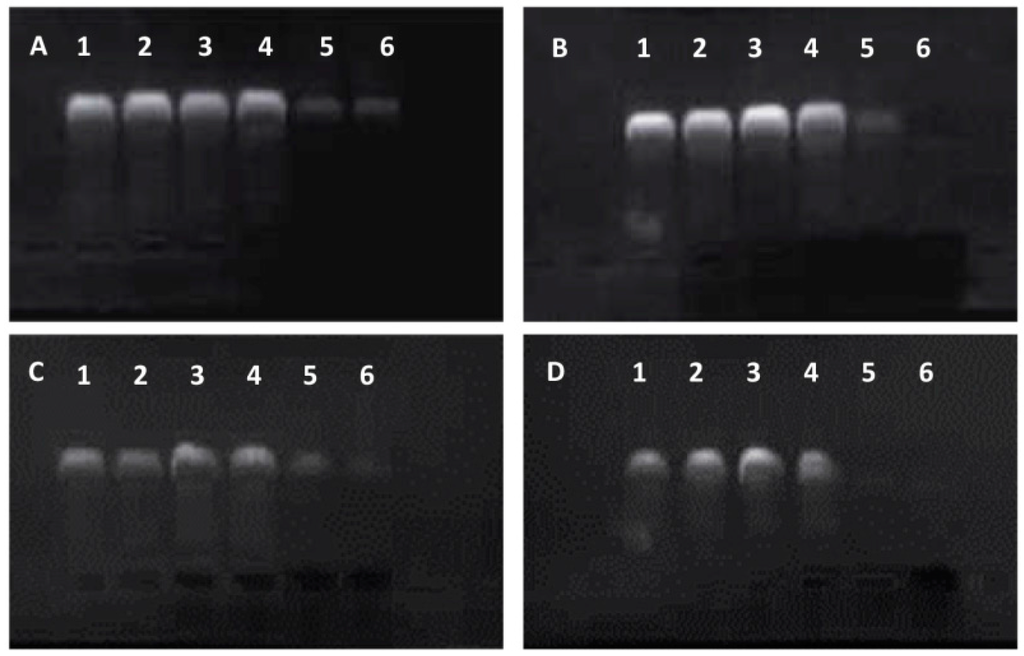 Electrophoretic mobility of f-MWCNTs: DNA complexes (A: S1:DNA; B: S2:DNA; C: S3:DNA; D: S4:DNA). In all panels, lane 1 represents 0.3 µg of free DNA. All other lanes contain f-MWCNTs complexes to 0.3 µg of DNA at various charge ratios: lane 2, 1:1; lane 3, 2:1; lane 4, 4:1, lane 5, 6:1, lane 6, 8:1.