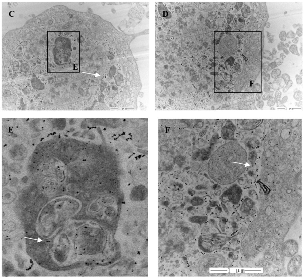 SEM and TEM images of CIK cell treated with MWCNTs-NH3+:DNA (S4:DNA). (A–B) CIK cell interacting with S4:DNA complexes; (C–F) ultrathin transverse section of CIK treated with S4:DNA complexes. MWCNTs-NH3+ is marked by white arrow.