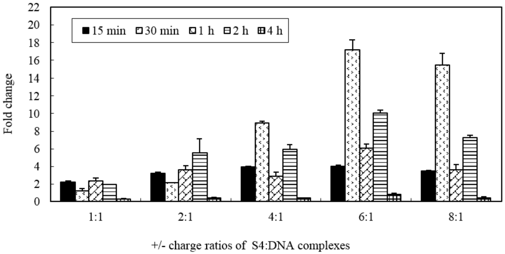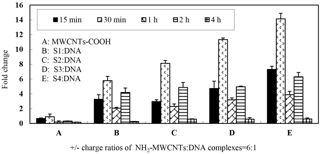 Furthermore, we monitored the gene expression level of which carbon nanotubes surface were functionalized by different structure of ammonium-group. Figure 6 shows the levels of marker gene (vp5) expression in CIK cells after exposure to different types of nanotubes connected to plasmid DNA encoding the gene. In this portion, 6:1 charge ratio was selected for each type of MWCNTs-NH3+ and plasmid DNA complexes. The data demonstrate that four types of complexes are able to transfect CIK cells with greater efficiency than naked DNA and S4 appear to be most efficient at gene transfer when complexed to plasmid DNA at the 6:1 charge ratio. As shown in Figure 6, it should be noted that a regular variation trend of the gene expression level was observed with increasing incubation times in all of the four groups. The first peak of gene expression was observed in the 30-min incubation period group, the gene expression level was 6–14 times higher than treatment of cells with DNA alone. The gene expression significantly declined after a 1-h incubation period and a second peak of gene expression was observed in the 2-h incubation group. Most interestingly, the S1 and S2 MWCNTs-NH3+ exhibited a significant difference in gene expression levels, however there was only a slight difference in the ammonium group structures. These results indicated that the structure of ammonium groups on the carbon nanotubes surface may play an important role while interacting with plasmid DNA as DNA vaccine.