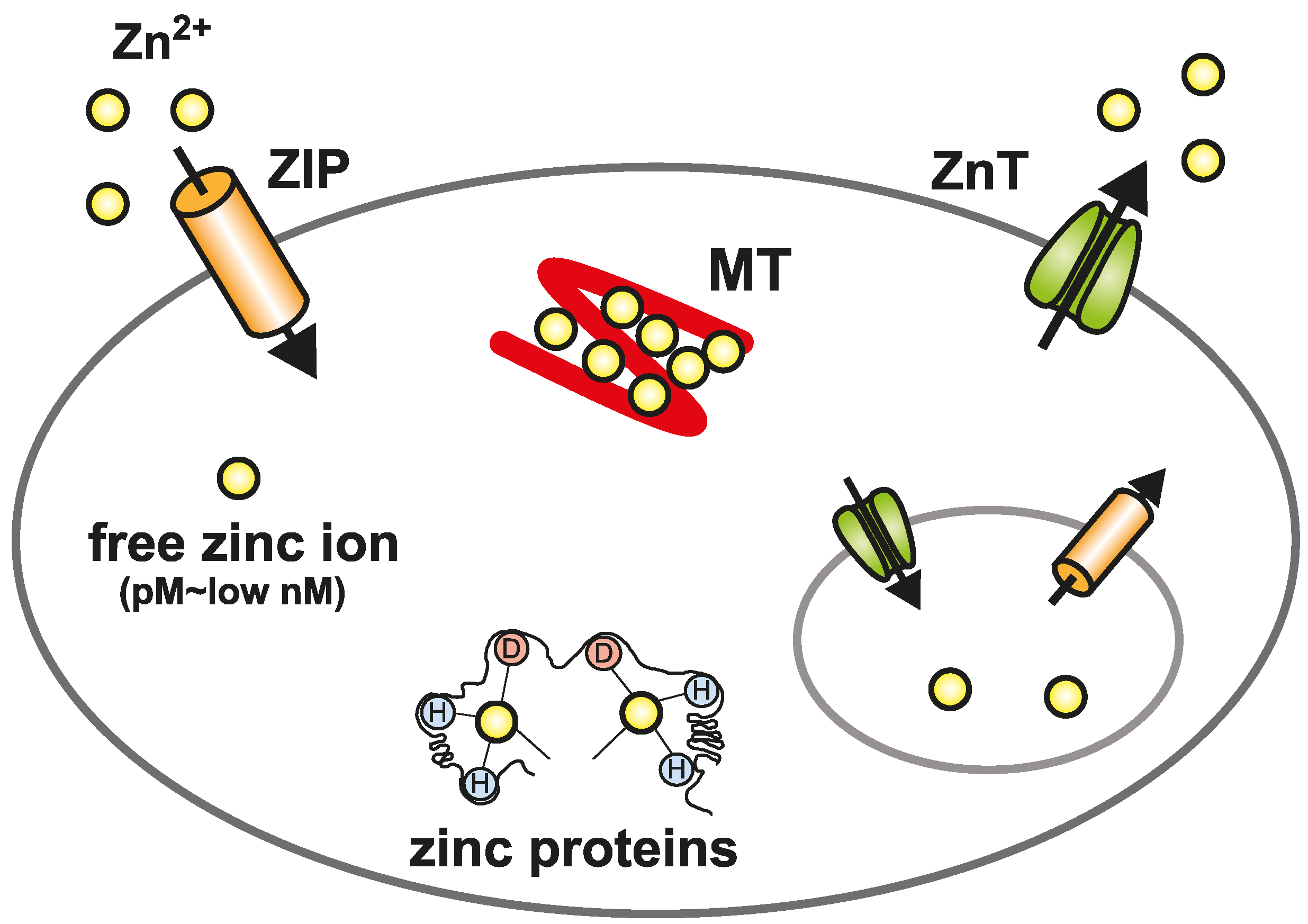 Cellular zinc homeostasis is controlled by the cooperative function of metallothioneins (MT) and Zrt- and Irt-like proteins (ZIP) and Zn transporters (ZnT). The mobilization of zinc into or out of the cytosol is directed by two zinc transporter families, ZIP and ZnT. In the cytosol, MTs bind zinc to reserve, buffer, and chelate. Zinc is compartmentalized into or out of intracellular organelles and vesicles by ZnT and ZIP transporters. Because of the binding of zinc to many different proteins, the free zinc ion concentration in the cytosol is estimated to be well below pM–low nM levels.
