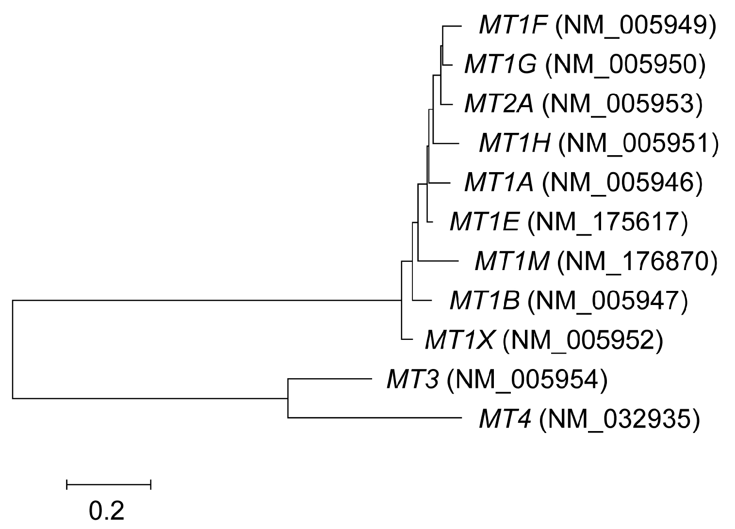 Phylogenetic tree of MT genes. The tree was constructed using coding sequences from NCBI RefSeq and the neighbor-joining method using MEGA6 software.