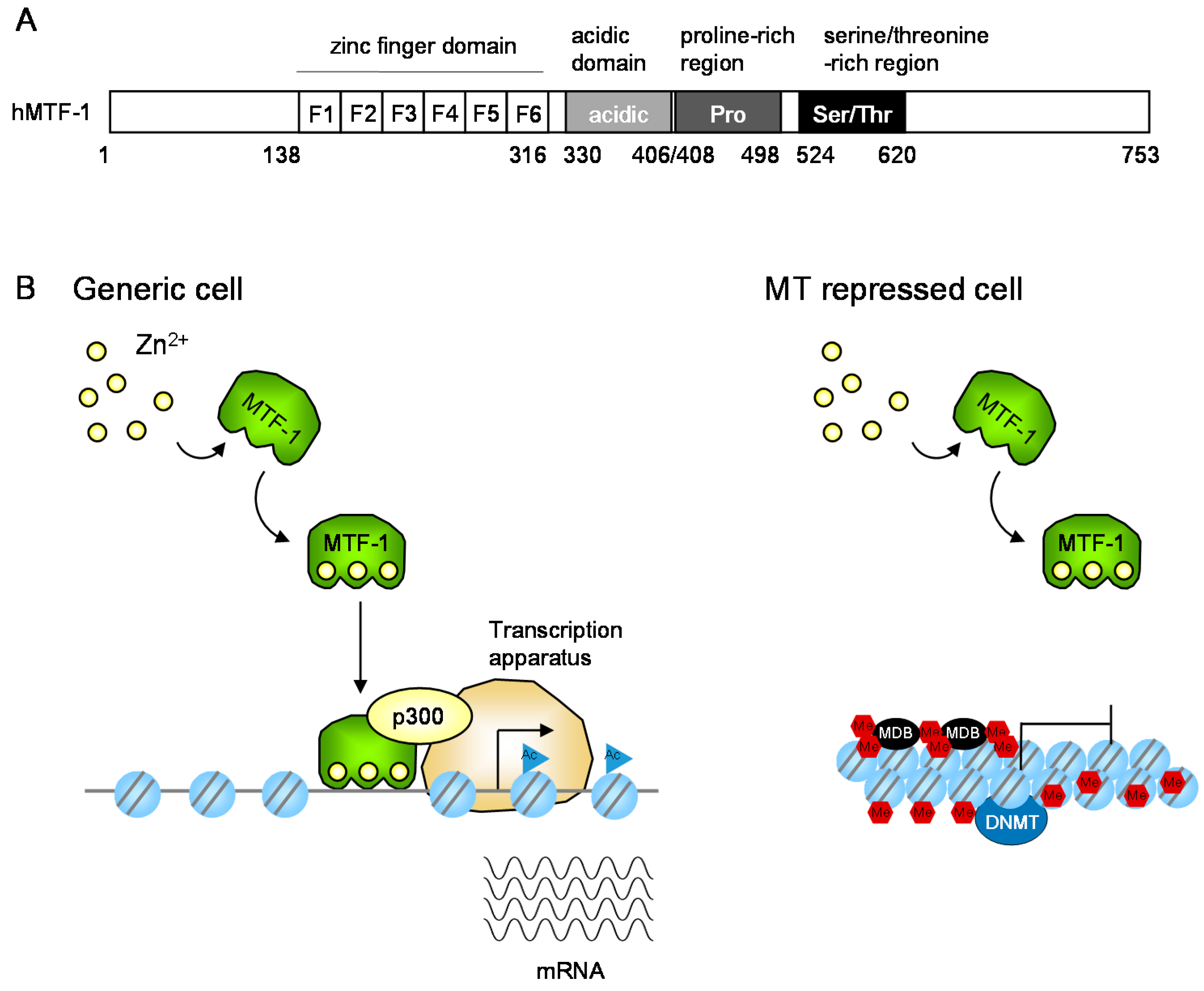 Expression regulation of MT gene expression. (A) Schematic representation of human metal response element-binding transcription factor-1 (MTF-1). The regions of the six-zinc fingers (F1–F6), acidic, proline-rich, and serine/threonine-rich domains are indicated by boxes and amino acid numbers; (B) Proposed molecular mechanisms in MT transcription in response to increases of intracellular free zinc. In generic cells, MTF-1 recruits the histone acetyltransferase p300 and increases MT transcription. In MT-repressed cells such as lymphosarcoma cells, and cancer cells, the promoter is highly methylated. DNA methyltransferase (DNMT) and methyl CpG binding proteins (MBD) are involved in the suppression. The epigenetic mechanism is described in Section 4.2. Ac, acetyl group; Me, methyl group; blue circle with two lines, nucleosome.