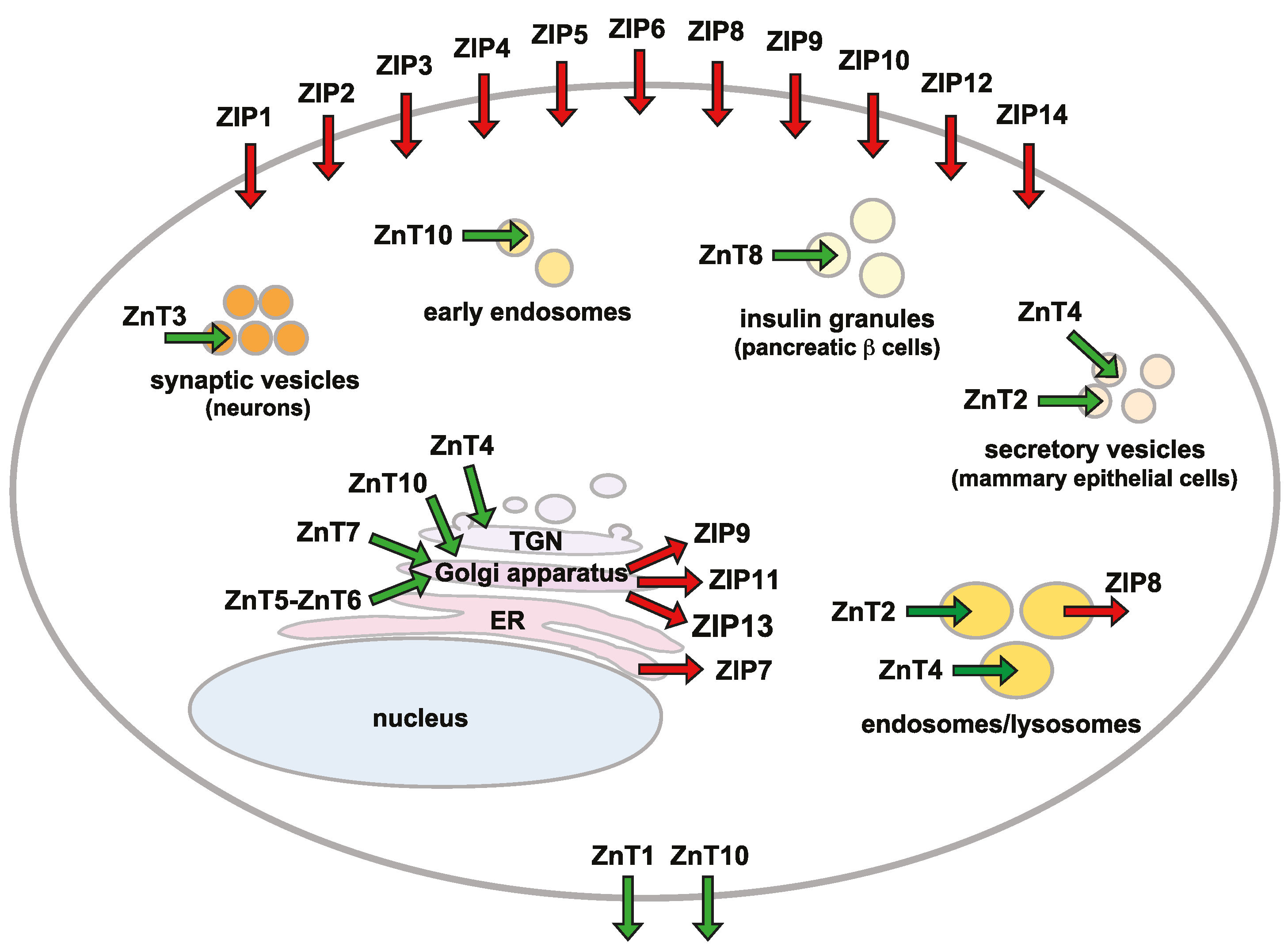 The subcellular localization of ZIP and ZnT transporters. The primary localization of ZIP (red arrows) and ZnT (green arrows) transporters is shown according to available information. This schematic illustrates a static view of their localization. Cytosolic zinc is mobilized into or out of different subcellular compartments, including synaptic vesicles or insulin granules in a cell-specific manner. ER, endoplasmic reticulum; TGN, trans-Golgi network.