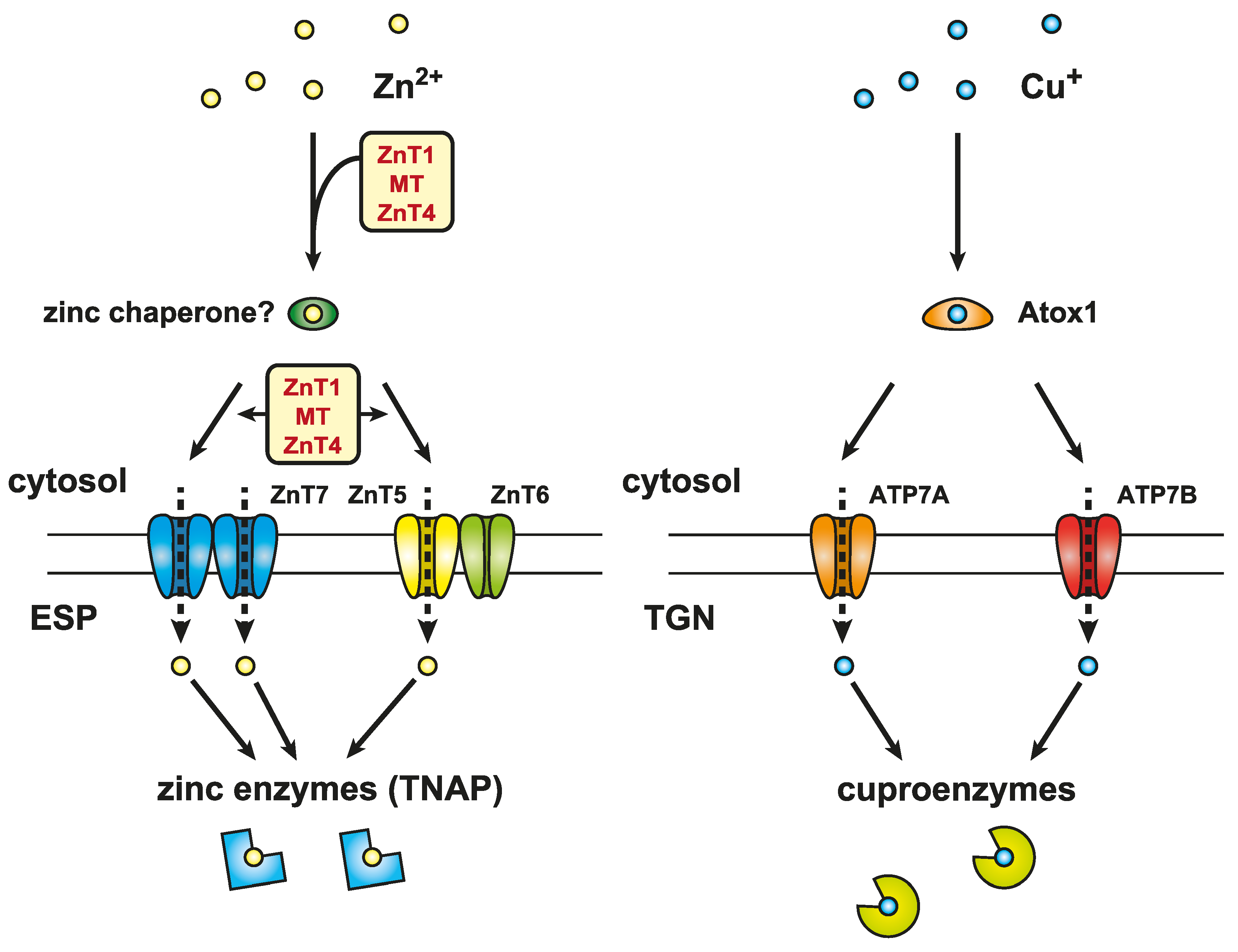 Cooperative function of MT, ZnT1, and ZnT4 in the activation of zinc-requiring ectoenzymes. The facilitated transfer of cytosolic zinc to ZnT5–ZnT6 heterodimers and ZnT7 homodimers may function under cooperative control of ZnT1, MT, and ZnT4 (left). ZnT1MTZnT4 KO cells exhibit significantly reduced TNAP activity (left), which is reminiscent of the phenotypes of cytosolic copper chaperone Atox1-deficient cells (right). Atox1 plays a crucial role as a copper chaperone in transferring cytosolic copper to two copper-transporting P-type ATPases, ATP7A and ATP7B, located in the trans-Golgi network (TGN). This therefore contributes to the activation of copper-requiring ectoenzymes (cuproenzymes). Considering the high level of analogy between ZnT1MTZnT4 KO and Atox1-deficient cells, a putative zinc chaperone under the cooperative control of ZnT1, MT, and ZnT4 is hypothesized to play a crucial role in facilitating the transfer of cytosolic zinc to ZnT5–ZnT6 heterodimers and ZnT7 homodimers (not shown) located in the early secretory pathway (ESP). This then contributes to the proper activation of zinc-requiring ectoenzymes such as TNAP (left).